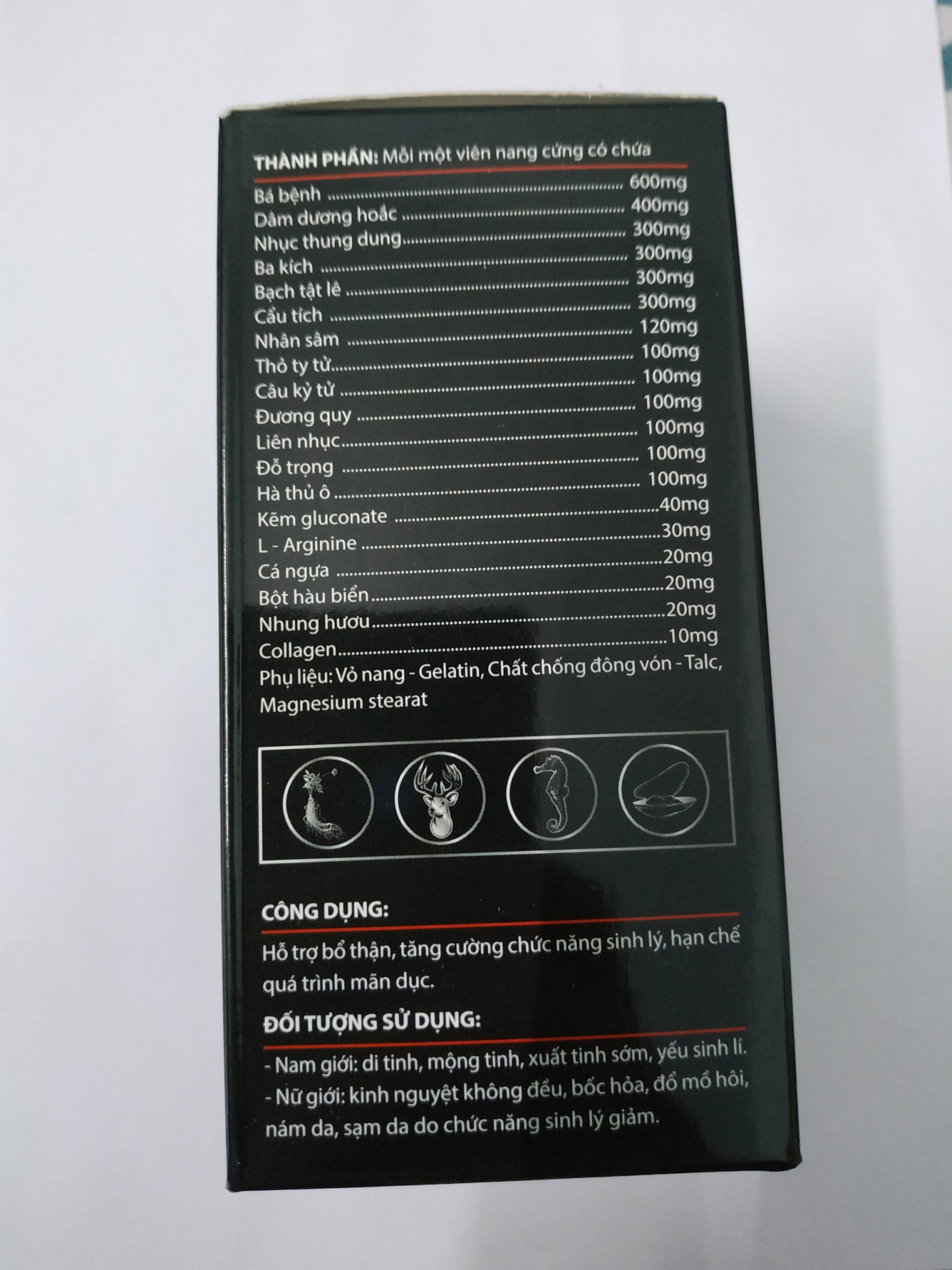 Mua tại TiktokCÔNG DỤNG: Hỗ trợ bổ thận, tăng cường chức năng sinh lý, hạn chế quá trình mãn dục. Giúp bổ thận, tráng dương, tăng cường sinh lực, tăng tiết hormone giới tính nam testosterone Phục hồi và tăng cường sức khỏe sinh lý nam giới. Cải thiện và làm chậm quá trình mãn dục, lãnh cảm tình dục Bồi bổ giúp cơ thể khỏe mạnh, sinh lý sung mãn ĐỐI TƯỢNG SỬ DỤNG: Nam giới: Liệt dương, di tinh, mộng tinh, xuất tinh sớm, yếu sinh lí, người bị mãn dục nam sớm, giảm tiết testosterone Nữ giới: Kinh nguyệt không đều, bốc hỏa, đổ mồ hôi, nám da, sạm da do chức năng sinh lý giảm. CÁCH DÙNG: Trẻ em trên 12 tuổi: uống 1 viên/ngày Người lớn: uống 1-2 viên/lần x 2 lần/ngày Uống sau ăn 15 phút sáng và tối Nên dùng 1 đợt 3 tháng để có hiệu quả tốt nhất QUY CÁCH ĐÓNG GÓI: Hộp 1 lọ 30 viên Bá bệnh: Tăng cường chức năng sinh dục và sức khỏe cho nam giới thông qua cơ chế kích hoạt cơ thể tự sản xuất testosterone nội sinh một cách tự nhiên. Ngoài ra, còn có tác dụng lợi mật, tăng cường chức năng tiêu hóa, dùng trong các trường hợp ăn khó tiêu, đầy bụng, nôn mửa, tiêu chảy, giảm hư tổn và tăng tái tạo tế bào gan, giải độc do uống nhiều rượu, chữa sốt rét Dâm dương hoắc: Tác dụng kích thích tình dục, điều trị suy giảm chức năng tình dục ở cả nam và nữ, cụ thể: Bổ thận, tráng dương, chữa liệt dương, ít tinh dịch, đau lưng mỏi gối. Tăng lượng testosterone trong máu, chống rối loạn cương dương, xuất tinh sớm, yếu sinh lý, tăng sự ham muốn. Chống hội chứng rối loạn tiền mãn kinh, mãn kinh ở phụ nữ. Tăng cường sức đề kháng: kích thích các tế bào miễn dịch, tăng sản xuất kháng thể interleukin-2, chống oxy hóa, giảm mệt mỏi. Ngoài ra, còn có tác dụng tăng lưu lượng máu mạch vành, bảo vệ tim, giảm huyết áp, giảm lipid máu, chống loãng xương do kích thích nguyên bào xương hoạt động trong tủy xương, làm cho xương phát triển chống loãng xương. Nhục thung dung: Tư âm, bổ thận, ích tinh, ích huyết, tráng dương, chữa liệt dương, đau lưng mỏi gối ở nam giới, chữa vô sinh, khí hư bạch đới ở nữ giới. Ba kích: Ôn thận trợ dương, dùng chữa lưng gối mỏi đau, bệnh liệt dương, sớm xuất tinh, di mộng tinh, phụ nữ kinh nguyệt không đều. Ngoài ra, còn dùng chữa phong thấp, mạnh gân cốt. Bạch tật lê: Bổ thận, trị đau lưng, tinh dịch không bền, gầy yếu. Ngoài ra, còn chữa đau mắt, nhức vùng mắt, chảy nước mắt. Cẩu tích: Bổ gan thận, chữa đau lưng, tiểu tiện nhiền lần, tiểu dắt. Chữa bệnh phụ nữ khí hư, bạch đới. Ngoài ra, còn trừ phong thấp, chữa đau khớp xương, đầu gối. Đối với phụ nữ, hà thủ ô được dùng chữa các bệnh sau khi đẻ, các bệnh xích bạch đới. Nhân sâm: Nhân sâm đại bổ nguyên khí, ích huyết sinh tân, định thần ích trí, tăng cường thể lực và trí lực. Tăng cường chức năng sinh dục: Tăng ham muốn tình dụcTăng sản xuất testosterone, chống rối loạn cương dương, tăng số lượng và chất lượng tinh trùng.Làm giảm triệu chứng thời kỳ tiền mãn kinh và mãn kinh. Tăng cường hệ miễn dịch, tăng sức chống đỡ của cơ thể, chống tác hại của stress, các tác nhân gây độc, chống mệt mỏi, suy nhược thần kinh, dùng trong các trường hợp cơ thể suy yếu, kiệt sức và thời kỳ dưỡng bệnh. Ngoài ra, còn có tác dụng chống oxy hóa, chống lão hóa, giảm cholesterol, LDL, tăng HDL, tăng cường phân giải tế bào mỡ, hạn chế béo phì, giảm nguy cơ xơ vữa động mạch. Tăng sức co bóp cơ tim, chống rối loạn nhịp tim. Thỏ ty tử: Bổ thận, chữa liệt dương, di tinh, đau lưng mỏi gối, tai ù, tiểu tiện đục, đi đái đêm. Câu kỷ tử: Bổ toàn thân, mạnh gân cốt, chữa chân tay yếu mỏi, mắt mờ, di mộng tinh. Bổ tinh khí, giữ cho người trẻ lâu. Ngoài ra, còn chữa ho, viêm phổi, dùng trong bệnh đái tháo đường Đương quy: Đương quy là đầu vị trong thuốc chữa bệnh phụ nữ. Đương quy bổ huyết, hoạt huyết, điều huyết thông kinh, chữa phụ nữ kinh nguyệt không đều, thấy kinh đau bụng. Làm thuốc bổ huyết, chữa thiếu máu, chân tay đau nhức và lạnh. Liên nhục: Bổ thận, cố tinh, chữa di tinh, chữa mất ngủ, thần kinh suy nhược. Đỗ trọng: Bổ can thận, mạnh gân cốt, an thai, chữa đau lưng, đi tiểu nhiều, chân gối yếu mềm. Hà thủ ô: Làm thuốc bổ, trị suy nhược thần kinh, ích huyết khỏe gân cốt, sống lâu, làm đen râu tóc. Kẽm gluconate: Tăng cường chức năng sinh lý nam, giúp duy trì số lượng tinh trùng, ổn định khả năng di động của chúng và giúp duy trì nồng độ nội tiết tố nam (testosteron) ở mức luôn luôn bình thường, do đó góp phần đáng kể trong sự thụ tinh. Kẽm còn có vai trò tăng cường hệ miễn dịch của cơ thể, giúp cơ thể ngăn ngừa viêm nhiễm, chống lại các tác nhân gây nhiễm khuẩn. Ngoài ra, kẽm cũng có vai trò kích thích vị giác, làm gia tăng cảm giác thèm ăn. Với hệ thống da, tóc, kẽm có vai trò đẩy nhanh quá trình tái tạo da, mọ