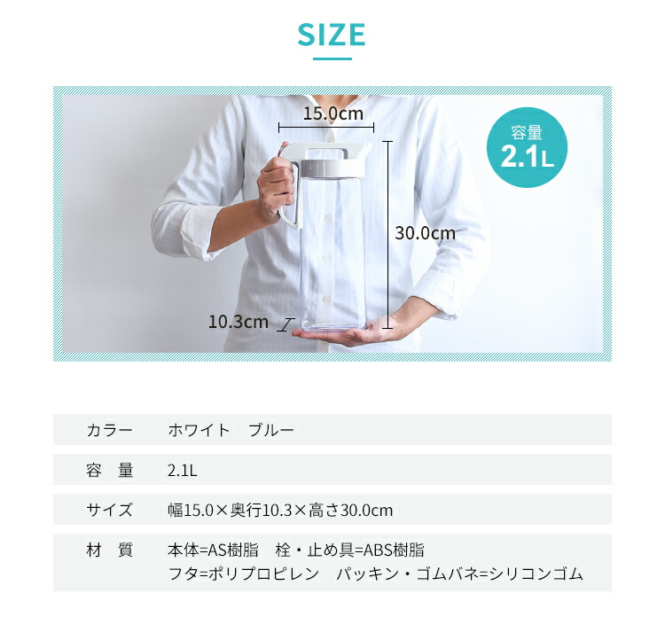 - Hỗ trợ đổi trả theo quy định. Chất liệu: Thân bằng nhựa AS kháng khuẩn an toàn, không chứa BPA, không sản sinh ra các hoạt chất gây hại trong quá trình sử dụng. Nắp khóa/ tay cầm bằng nhựa Polypropylen (PP). Gioăng bằng silicone an toàn Màu sắc: màu trắng - xanh Kích thước: 15.2×10.3×29.5Hcm Dung tích: 2.1 lít Công dụng: Dùng để chứa đựng & bảo quản các loại nước, nước ép trái cây hay coffee, trà, sữ Rất tiện dụng & an toàn với nắp khóa vặn xoay HDSD & Bảo quản :