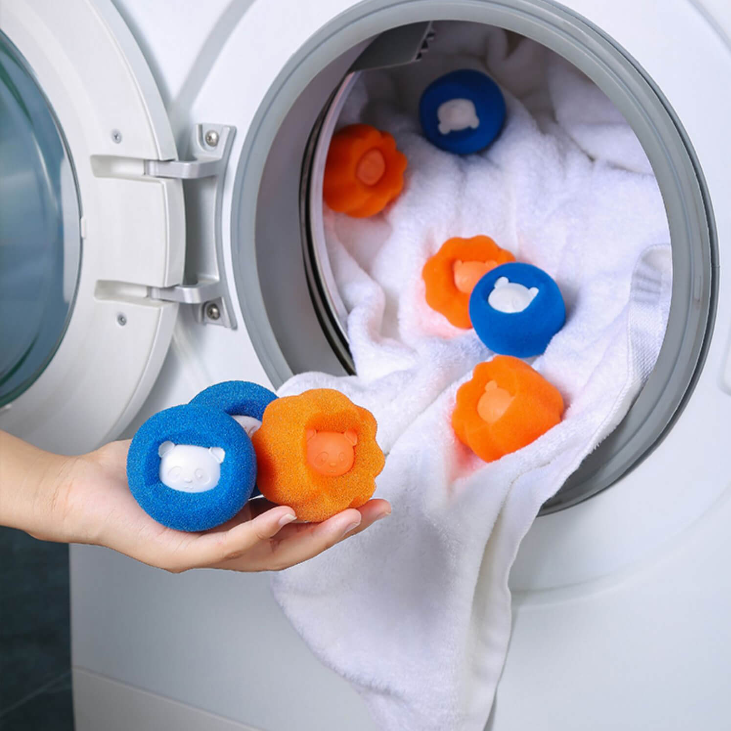 - Khi máy giặt xoay, thông qua ma sát với quần áo, có thể thấm hút lông, xơ vải, vết bẩn,v.v., trên quần áo một cách hiệu quả, giúp quần áo sạch hơn