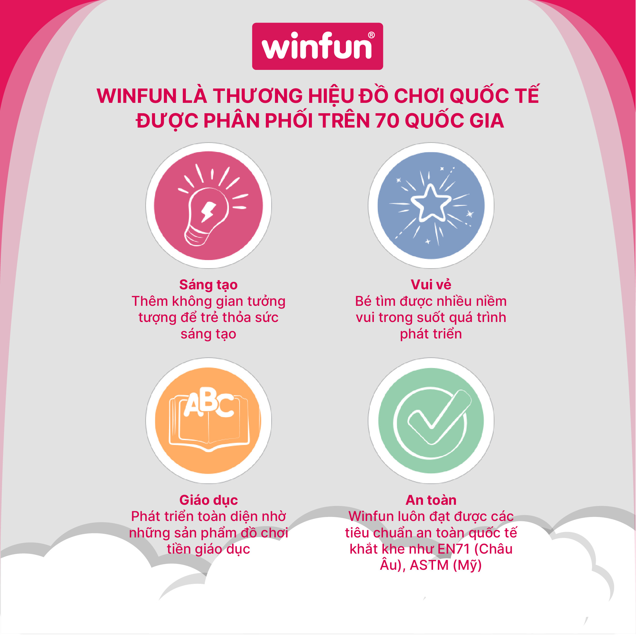 - Chứng nhận an toàn chất lượng: ASTM (Mỹ), EN71 (Châu u) =====THƯƠNG HIỆU WINFUN===== Winfun - Thương hiệu đồ chơi thông minh hàng đầu thế giới - Phát triển được phát triển bởi đội ngũ chuyên gia bao gồm các bậc phụ huynh là những nhà tâm lý học nghiên cứu và sản xuất. Với sứ mệnh sản xuất đồ chơi thông minh, an toàn, biến mỗi ngày của trẻ thơ trở nên đáng quý, đáng nhớ, Winfun mong muốn có thể xây dựng một thế giới đồ chơi hạnh phúc cho bé, cùng các bậc phụ huynh nuôi con lớn khôn từng ngày. Các sản phẩm của Winfun được thiết kế để kích thích sự phát triển tối đa 80% não bộ của bé từ 1 tới 3 tuổi, bao gồm các giai đoạn: từ 0 – 6 tháng; 6 – 12 tháng; 12 – 18 tháng; 18 – 36 tháng tuổi Các dòng đồ chơi của Winfun làm bằng nhựa cao cấp đảm bảo chất lượng và độ an toàn khi các bé sử dụng, đạt chuẩn quốc tế của ASTM – American Society for Testing and Material, tức Hiệp hội Kiểm nghiệm và Nguyên liệu Hoa Kỳ. Sứ mệnh giúp bé yêu phát triển toàn diện của thương hiệu đồ chơi chuẩn “5 sao” WINFUN: thương hiệu đồ chơi chuẩn “5 sao” ra đời với sứ mệnh giúp bé yêu phát triển trên mọi phương diện nhận thức – cảm xúc – thể chất. "Winning is only half of it, having fun is the other half”