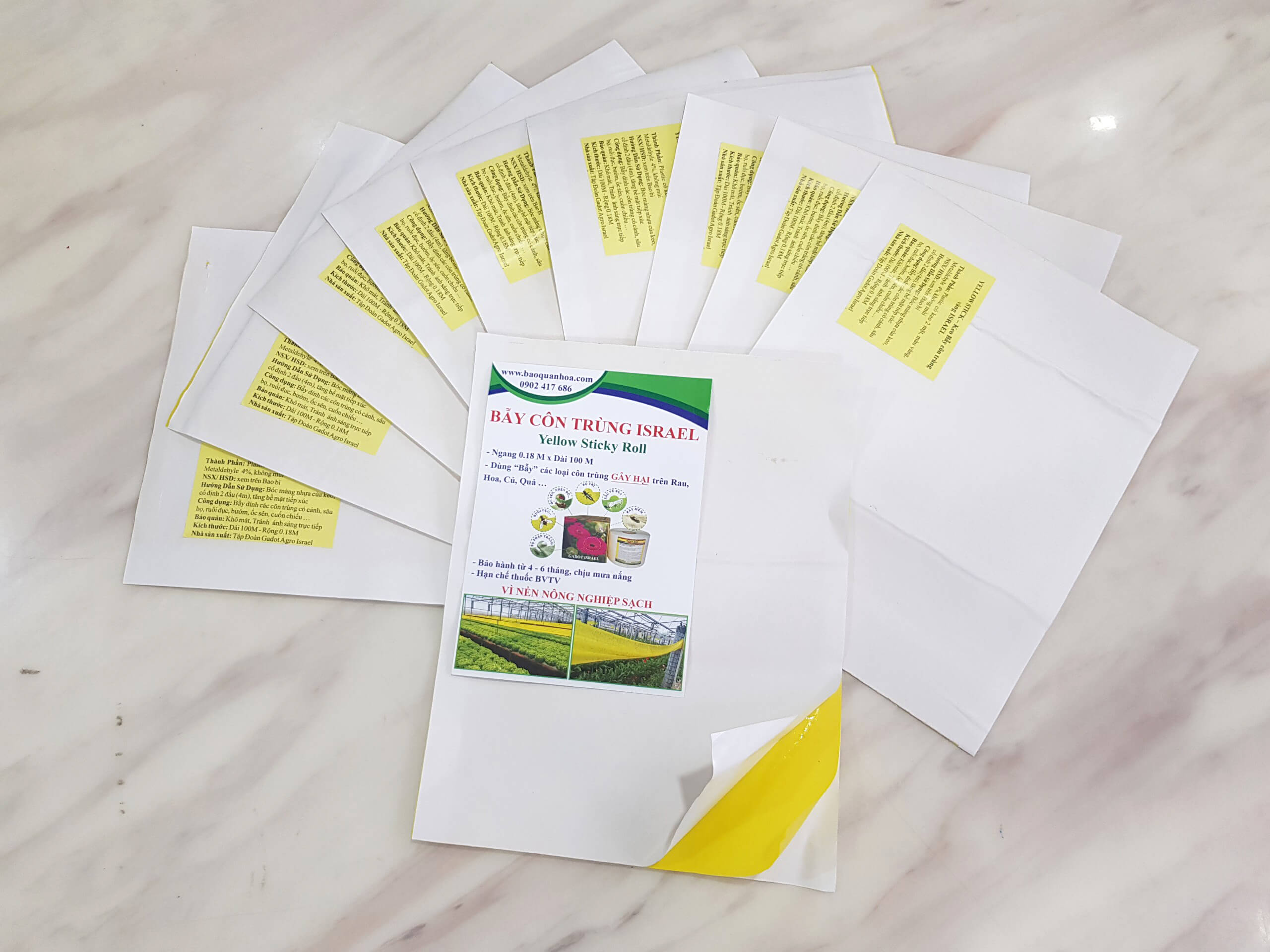 - Bẫy côn trùng ISRAEL (Sticky Yellow Roll) là dạng bẫy dính hấp thụ côn trùng bằng màu sắc với một lớp keo mỏng để bắt côn trùng lại. Bẫy dính có màu vàng là chủ đạo nên hoàn toàn an toàn cho rau màu có đăng ký tiêu chuẩn VietGap, GlobalGà không bị rửa trôi khi cả trời mưa.