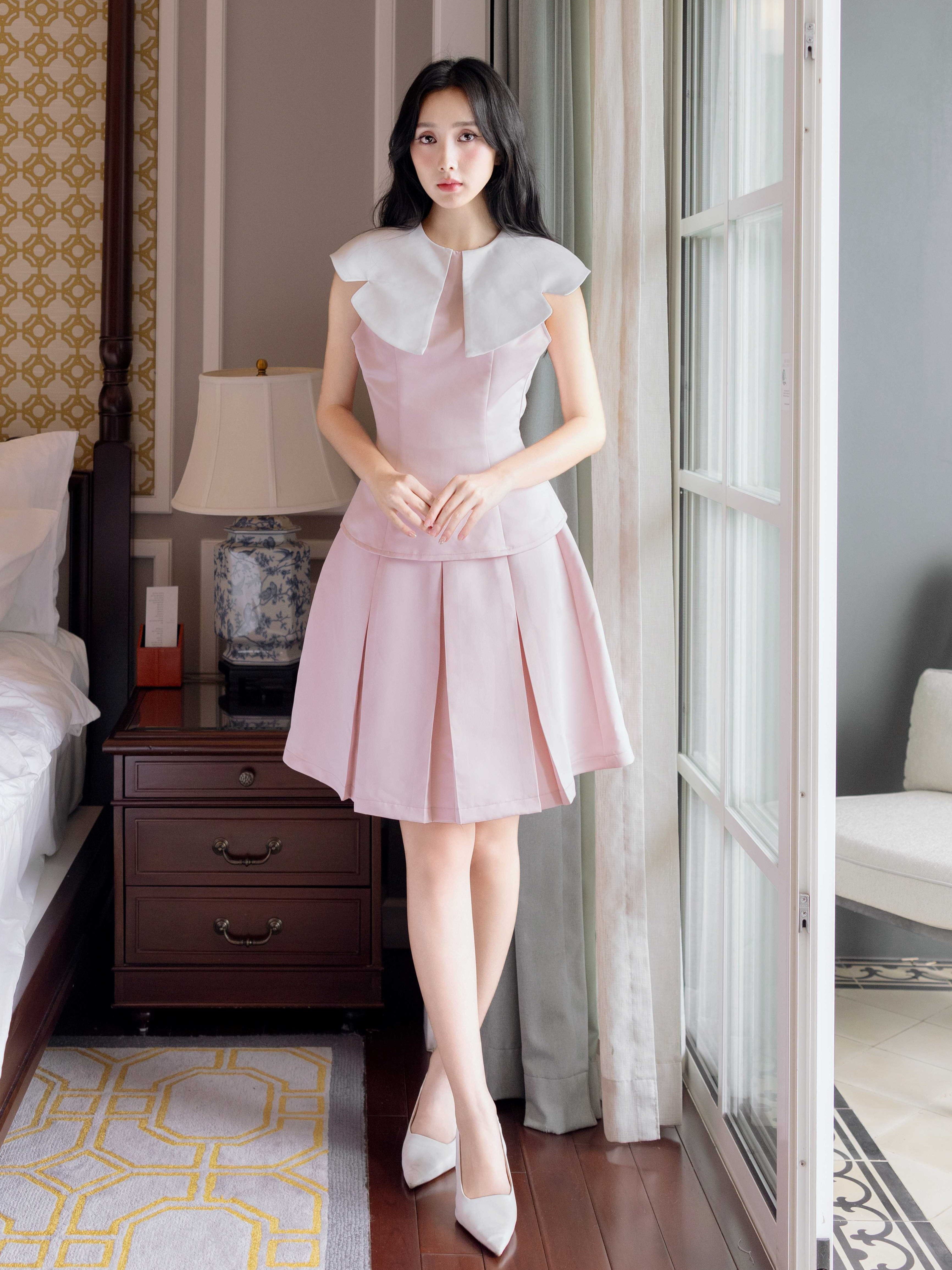 ✨Set áo váy hồng cổ sen NGADO , set áo kèm váy , set váy xếp ly