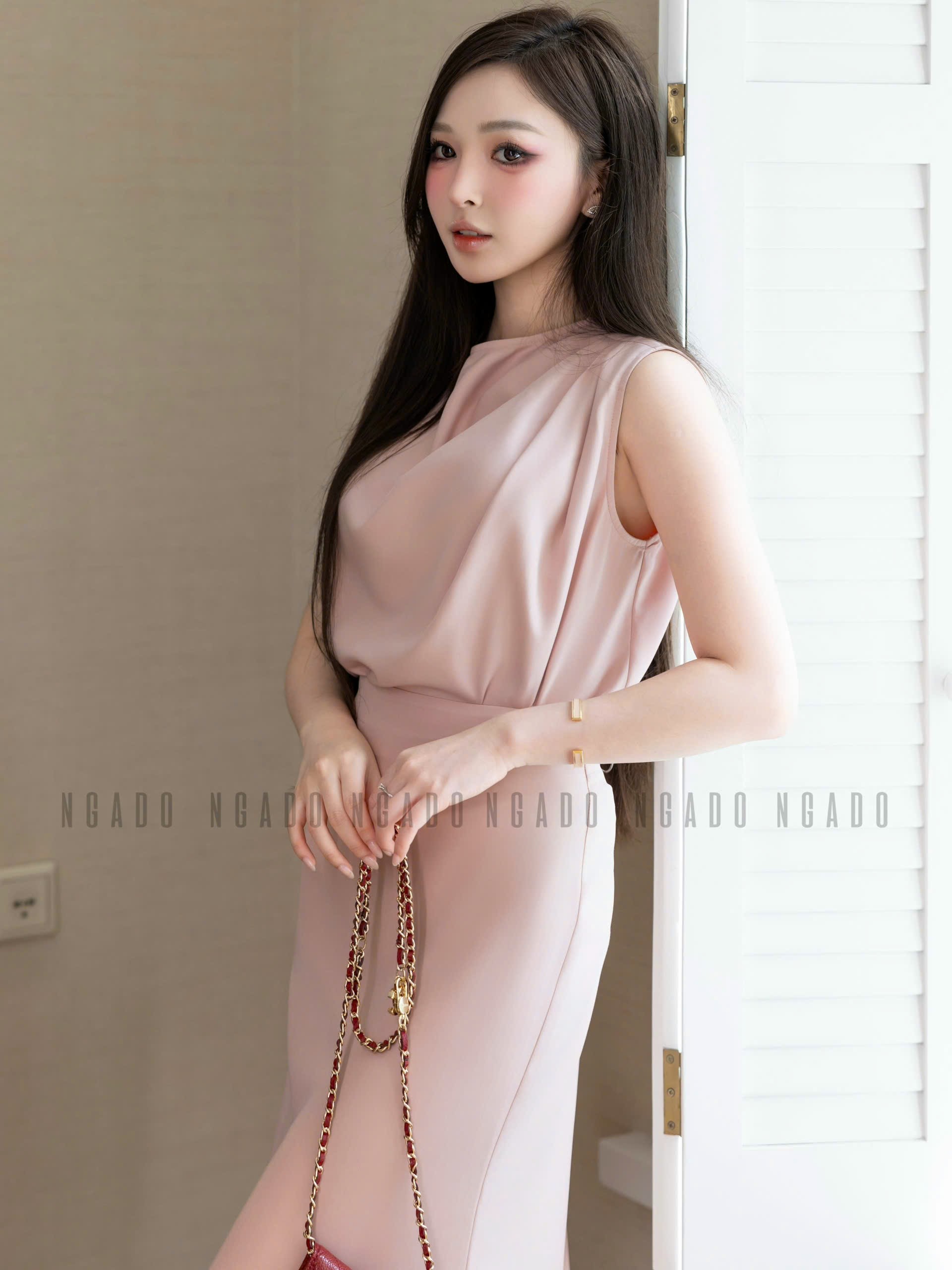 ✨Set áo váy hồng sát nách xếp ly NGADO , set áo váy dài , set áo váy hồng
