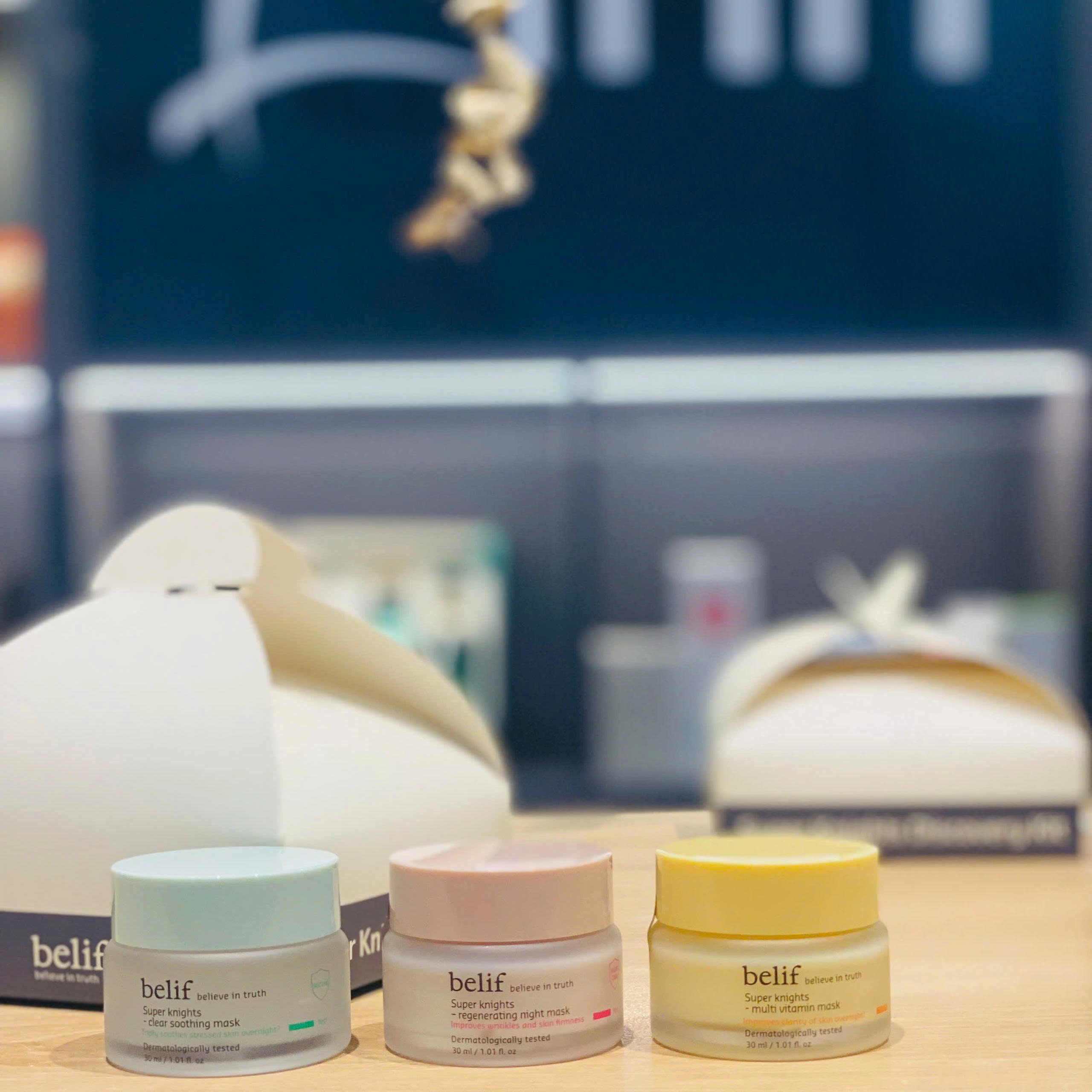Mua tại Tiktokđến thật đúng lúc! Phiên bản mở bán với số lượng giới hạn, chứa cùng lúc 3 chiến binh mặt nạ ngủ Super Knights đình đám của belif để bạn dùng thử với size nhỏ hơn - hiệu quả nguyên bản: Multi Vitamin Mask 30ml: Da đầy sức sống với phức hợp 4 vitamin B3, B12, C và E Regenerating Mask 30ml: Tái sinh da và chăm sóc các nếp nhăn, kém săn chắc Clear Soothing Mask 30ml: Cấp ẩm nhanh, hạ nhiệt tức thì cho da mùa nóng