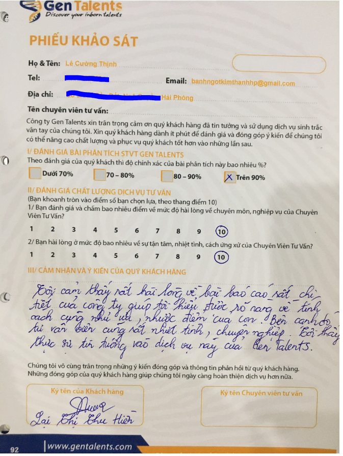 Chúng tôi tự hào là đội ngũ có chất lượng cao về chuyên môn phân tích, tham vấn bài báo cáo sinh trắc vân tay Gentalents được khẳng định bởi sự hài lòng của rất nhiều khách hàng đến từ các tỉnh thành khác nhau trên toàn quốc đã trải nghiệm dịch vụ tư vấn thời gian qua!