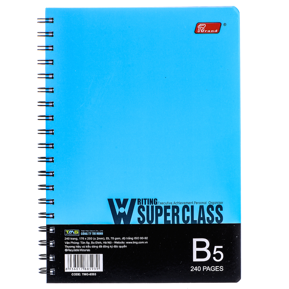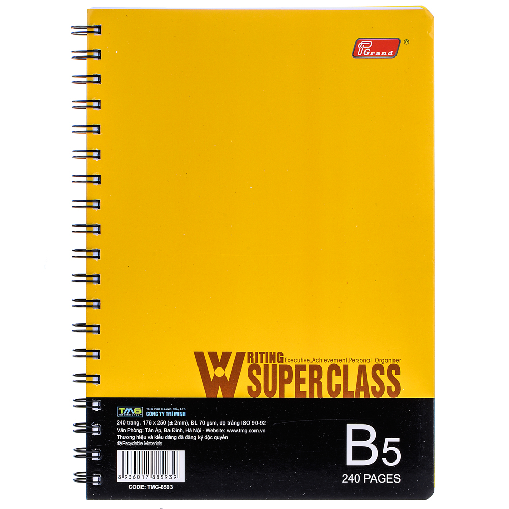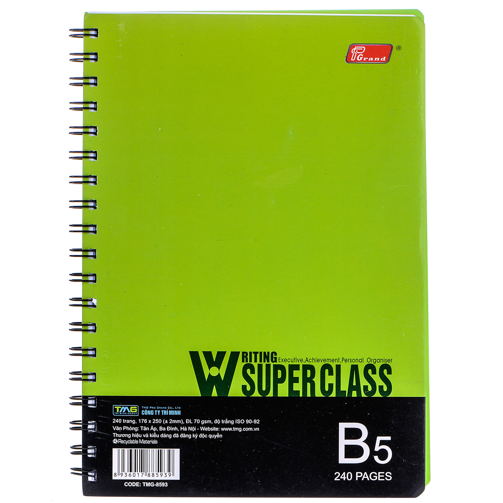 Sổ Lò Xo Grand B5 240 Trang Bìa Giấy thiết kế đơn giản, hiện đại và đẹp mắt. Form giấy cứng cáp, giữ sổ không bị gấp gãy, không nhăn nhàu. Chất liệu giấy cao cấp 70gsm với độ trắng 90-92 ISO, bề mặt giấy mịn màng, cho nét chữ trơn tru, mượt mà và rõ nét. Bạn có thể dùng sổ ghi chép những thông tin cần thiết, đặc biệt dễ dàng tháo rời từng tờ khi cần đến.