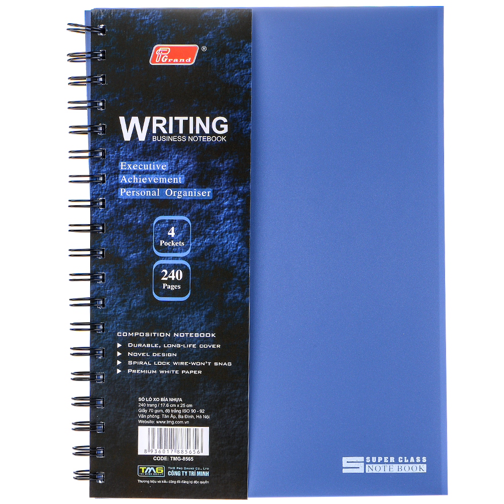Sổ Lò Xo Grand B5 240 Trang Bìa Nhựa form đứng cứng cáp, chống thấm nước, bảo vệ sổ hiệu quả. Đây là dạng sổ lò xo hiện rất được ưa chuộng trên thị trường. Chất liệu giấy cao cấp 70gsm với độ trắng 90-92 ISO, không gây nhức mỏi mắt khi nhìn lâu.