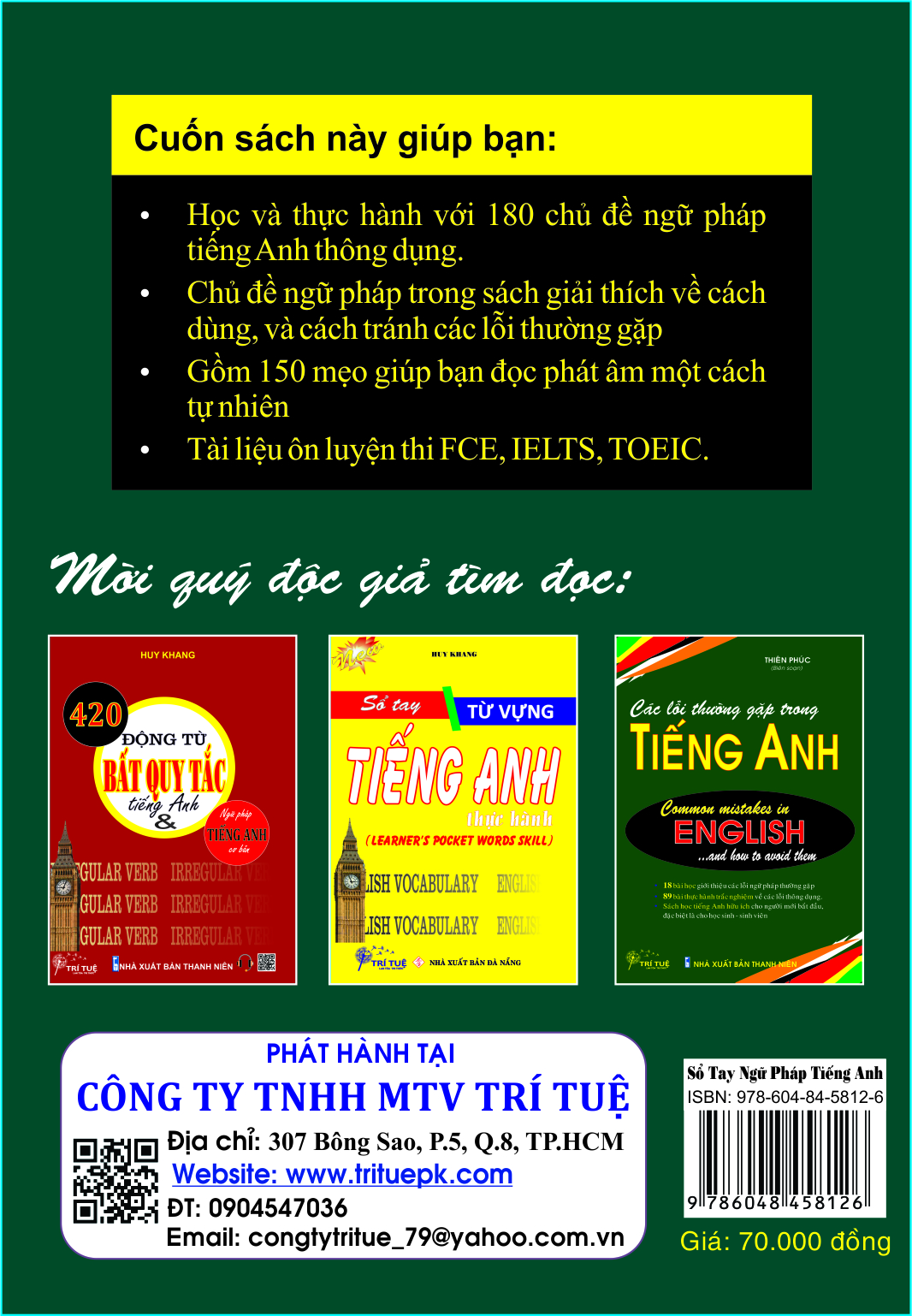 Sổ tay Ngữ pháp tiếng Anh thực hành Cuốn sách này giúp bạn: - Học và thực hành với 180 chủ đề ngữ pháp tiếngAnh thông dụng. - Chủ đề ngữ pháp trong sách giải