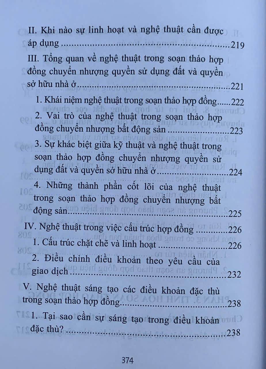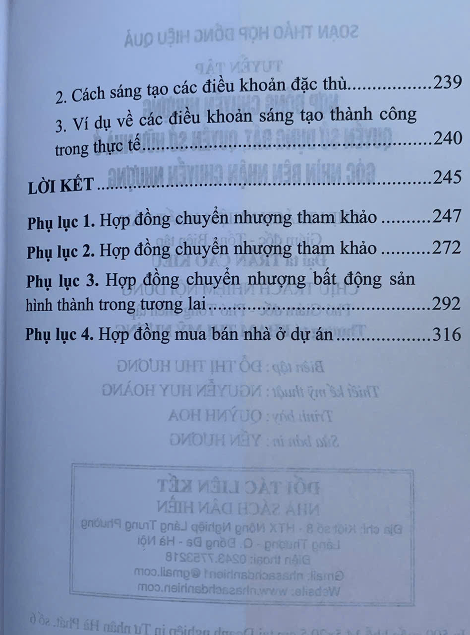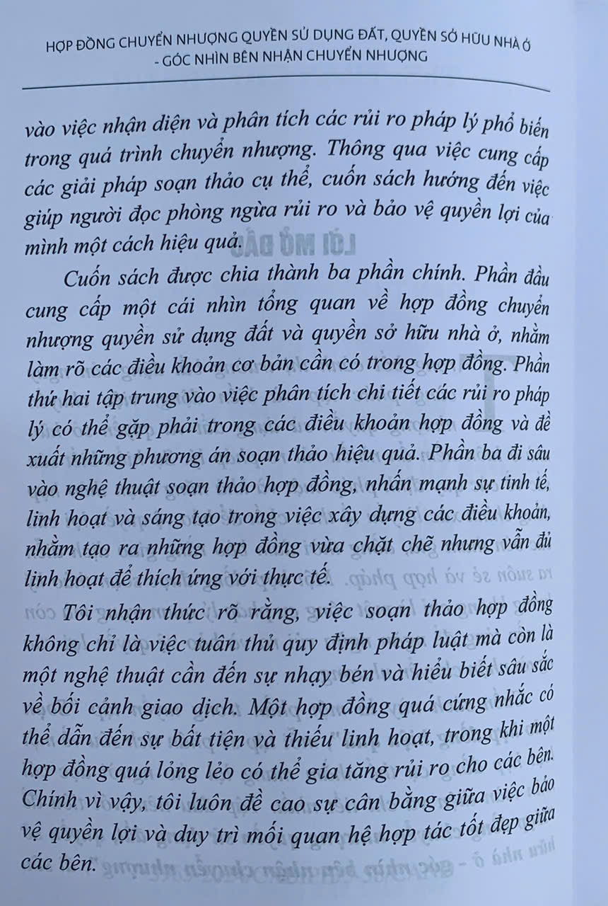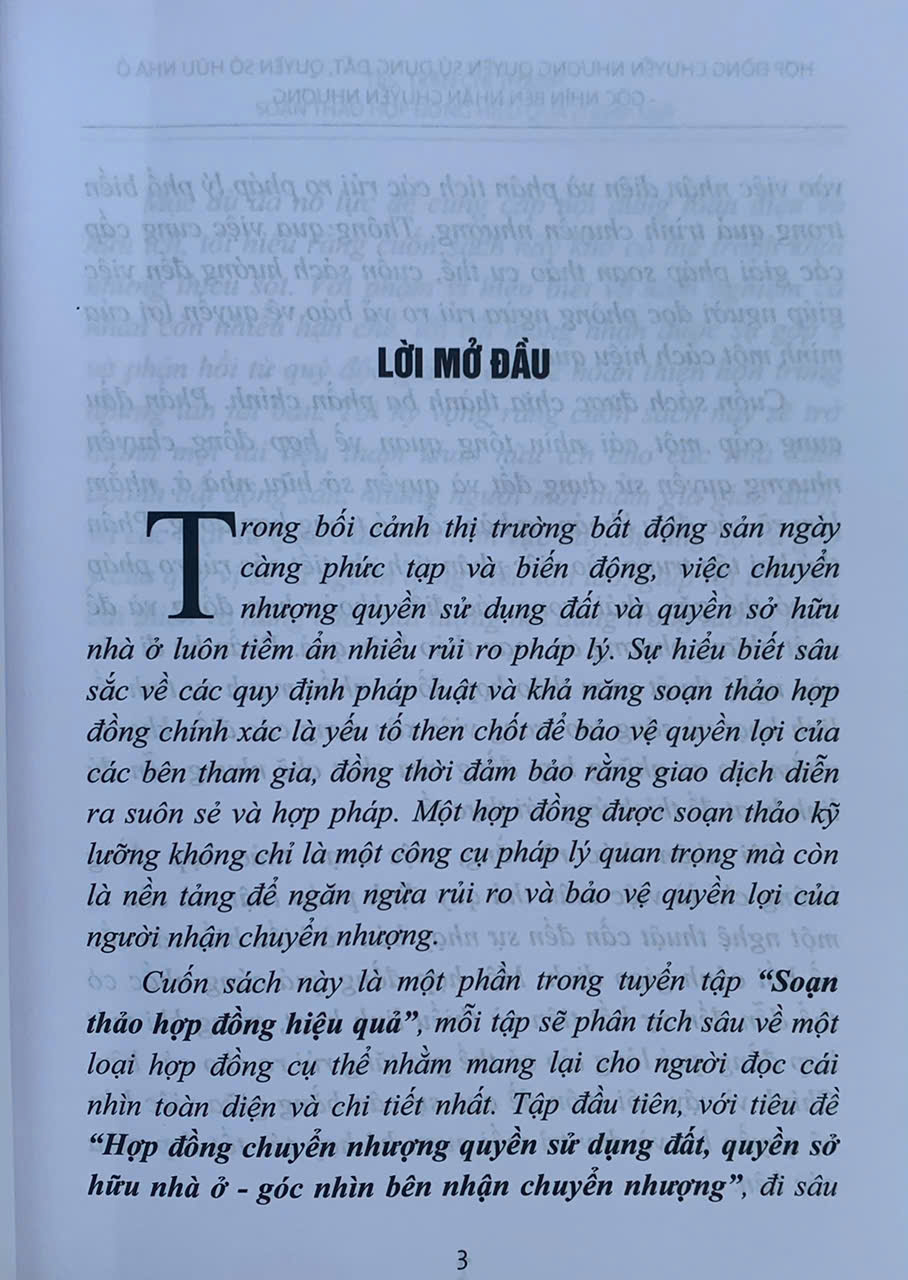 Trong bối cảnh thị trường bất động sản ngày càng phức tạp và biến động, việc chuyển nhượng quyền sử dụng đất và quyền sở hữu nhà ở luôn tiềm ẩn nhiều rủi ro pháp lý. Sự hiểu biết sâu sắc về các quy định pháp luật và khả năng soạn thảo hợp đồng chính xác là yếu tố then chốt để bảo vệ quyền lợi của các bên tham gia, đồng thời đảm bảo rằng giao dịch diễn ra suôn sẻ và hợp pháp. Một hợp đồng được soạn thảo kỹ lưỡng không chỉ là một công cụ pháp lý quan trọng mà còn là nền tảng để ngăn ngừa rủi ro và bảo vệ quyền lợi của người nhận chuyển nhượng. n sự mỗi nối thành sign tôn ba Cuốn sách này là một phần trong tuyển tập “Soạn thảo hợp đồng hiệu quả”, mỗi tập sẽ phân tích sâu về một loại hợp đồng cụ thể nhằm mang lại cho người đọc cái nhìn toàn diện và chi tiết nhất. Tập đầu tiên, với tiêu đề “Hợp đồng chuyển nhượng quyền sử dụng đất, quyền sở hữu nhà ở - góc nhìn bên nhận chuyển nhượng”, đi sâu vào việc nhận diện và phân tích các rủi ro pháp lý phổ biến trong quá trình chuyển nhượng. Thông qua việc cung cấp các giải pháp soạn thảo cụ thế, cuốn sách hướng đến việc giúp người đọc phòng ngừa rủi ro và bảo vệ quyền lợi của mình một cách hiệu quả.