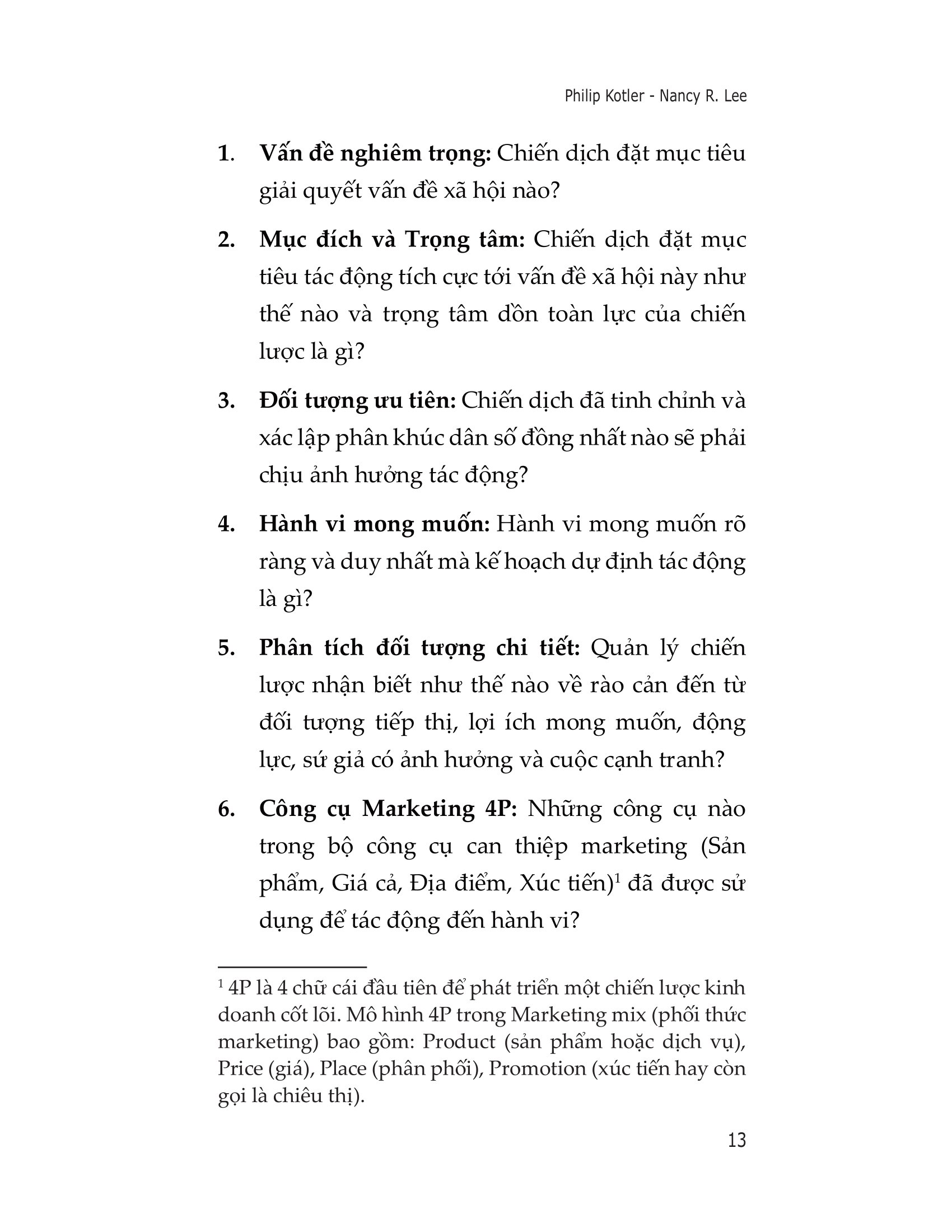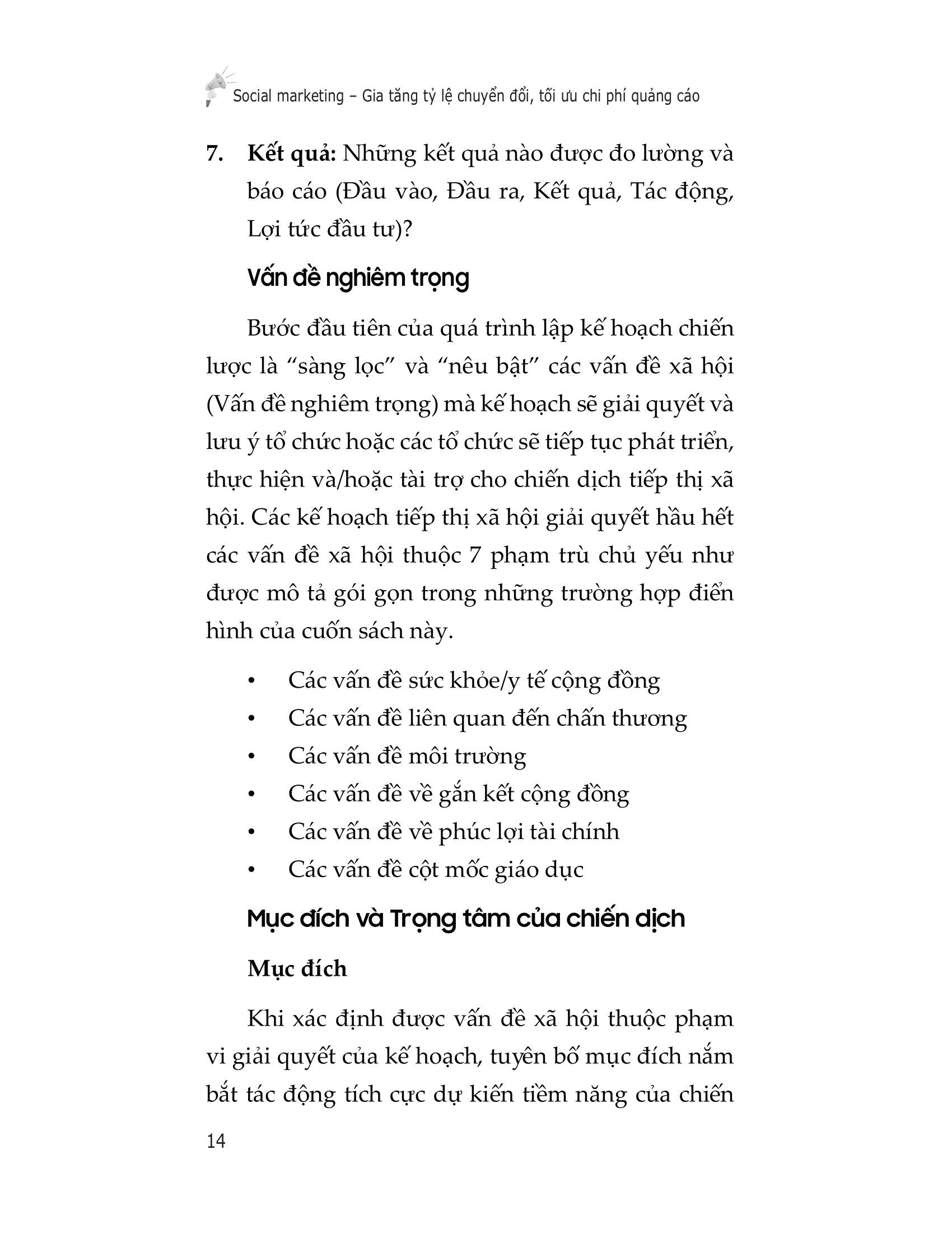 Social marketing – Gia tăng tỷ lệ chuyển đổi, tối ưu chi phí quảng cáo bao gồm một phổ các nghiên cứu trường hợp điển hình về các chủ đề được công chúng quan tâm như sức khỏe cộng đồng, giáo dục, an toàn, phúc lợi tài chính và các vấn đề môi trường. Cuốn sách sử dụng một cách hữu ích khuôn khổ trình bày chiến lược nhất quán lấy căn cứ là các nguyên tắc Tiếp thị xã hội để kể câu chuyện về các trường hợp được đặt ra trong cuốn sách. Khuôn khổ nhất quán và hữu ích này giúp nhấn mạnh sức mạnh của Tiếp thị xã hội trong việc thúc đẩy/tăng cường hình thành, phát triển, cung cấp và đánh giá các chương trình vì lợi ích xã hội.