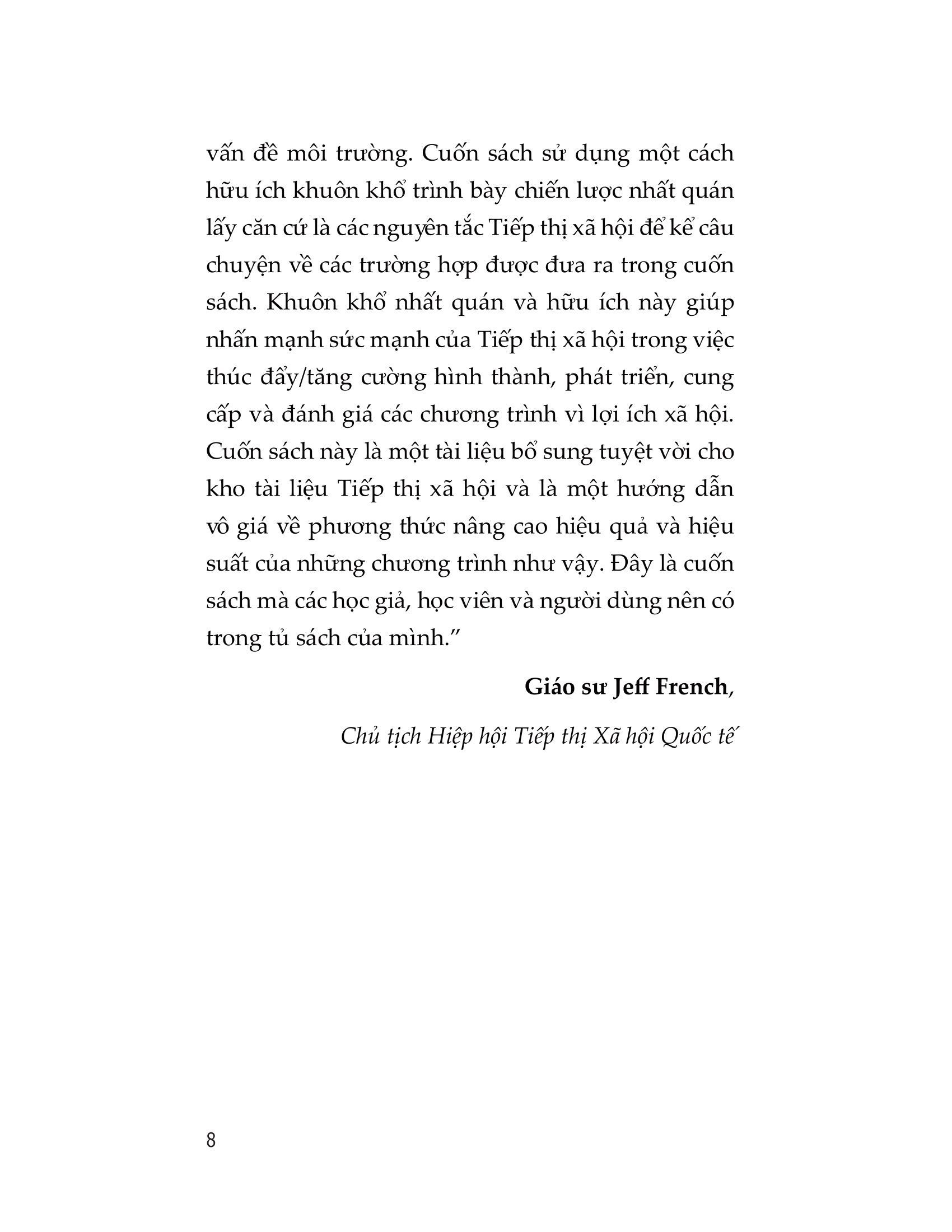 Cuốn sách Social marketing – Gia tăng tỷ lệ chuyển đổi, tối ưu chi phí quảng cáo là một hướng dẫn vô giá đối với cả những người vốn quen thuộc với tiếp thị xã hội và những người mới tham gia vào lĩnh vực này. Cuốn sách cung cấp một cái nhìn tổng quan vô giá thông qua những ví dụ thực tế về đóng góp của các nguyên tắc Tiếp thị xã hội dựa trên một phạm vi các thách thức xã hội rộng lớn.