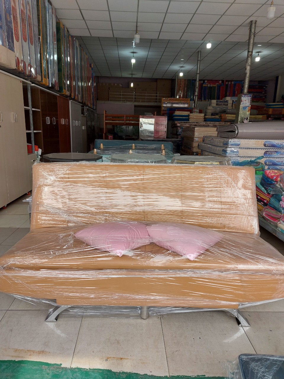 Giới thiệu Sofa giường 1m8 chất da màu vàng chân gỗ chắc chắn kích thước : Màu da bò 1m8 x 95 cm x Cao 85 cm, có thể làm sofa hoặc bật ra làm giường.