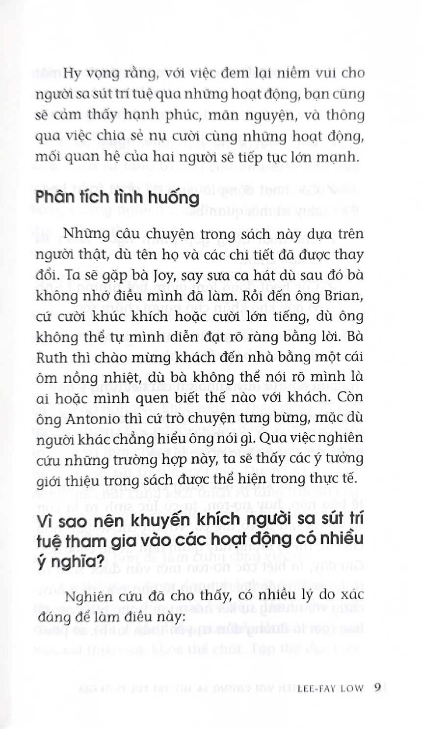 Sống An Nhiên Với Chứng Sa Sút Trí Tuệ Tuổi Già Chúng ta luyện tập các cơ để cơ thể khỏe mạnh, mềm dẻo và làm việc tốt hơn. Tương tự, chúng ta cũng cần luyện tập các cơ đầu óc để giữ cho bộ não mạnh khỏe, mềm dẻo và hoạt động hiệu quả. Ngoài ra, chúng ta cũng cần luyện tập các “cơ quan hệ” (mạng lưới xã hội và bạn bè). Đây là tất cả những gì mà cuốn sách này muốn đề cập đến – củng cố và duy trì sức mạnh cho các cơ đầu óc và quan hệ của những người mắc chứng sa sút trí tuệ tuổi già mà bạn đang chăm sóc. Hy vọng rằng, với việc thực hiện các hoạt động đem lại niềm vui cho người sa sút trí tuệ, bạn cũng sẽ cảm thấy hạnh phúc, mãn nguyện, và thông qua việc chia sẻ nụ cười cùng những hoạt động, mối quan hệ của hai người sẽ tiếp tục lớn mạnh.