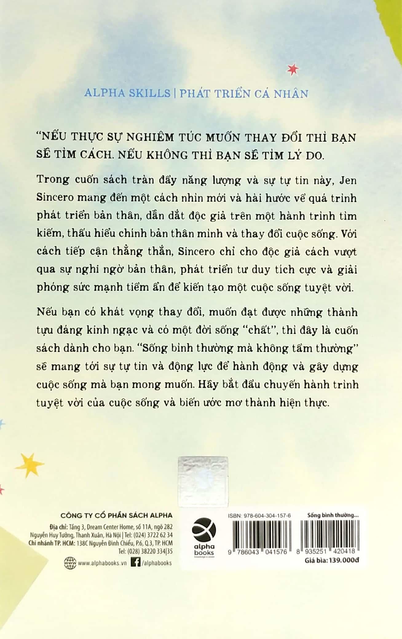 Sống Bình Thường Mà Không Tầm Thường "Sống Bình Thường Mà Không Tầm Thường" là phiên bản bìa mới của cuốn "Bạn Thật Bá Đạo" Cuốn sách dành cho những người tuyệt vọng, muốn cải thiện cuộc đời nhưng không muốn phạm pháp. Trong cuốn sách mới mẻ và đầy tính giải trí này, nhà văn và huấn luyện viên Jen Sincero đã mang tới 27 chương tràn đầy những câu chuyện hài hước và khơi gợi cảm hứng, những lời khuyên thông thái, các bài tập đơn giản, thỉnh thoảng có những câu chửi thề, giúp bạn có thể: