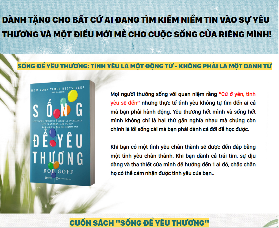 Liệu bạn có biết rằng tình yêu thương có một đặc điểm diệu kỳ? Nó không có ranh giới và không bao giờ tuân theo quy tắc mà chúng ta cố áp đặt. Nó cứ đến và nảy nở một cách tự nhiên như thể vị trí của nó vốn dĩ là ở đó vậy. Trong cuộc sống, bất cứ ai trong chúng ta cũng có thể tìm được niềm vui và hạnh phúc qua những việc làm giản đơn và ý nghĩa, đó là sự cảm thông và cho đi. Và đó cũng chính là thông điệp xuyên suốt tác phẩm “Sống để yêu thương” mà Bob Goff muốn truyền tải đến cho các độc giả. Ở Goff, ông tin rằng cuộc sống của chúng ta nên được thúc đẩy bởi tình yêu.