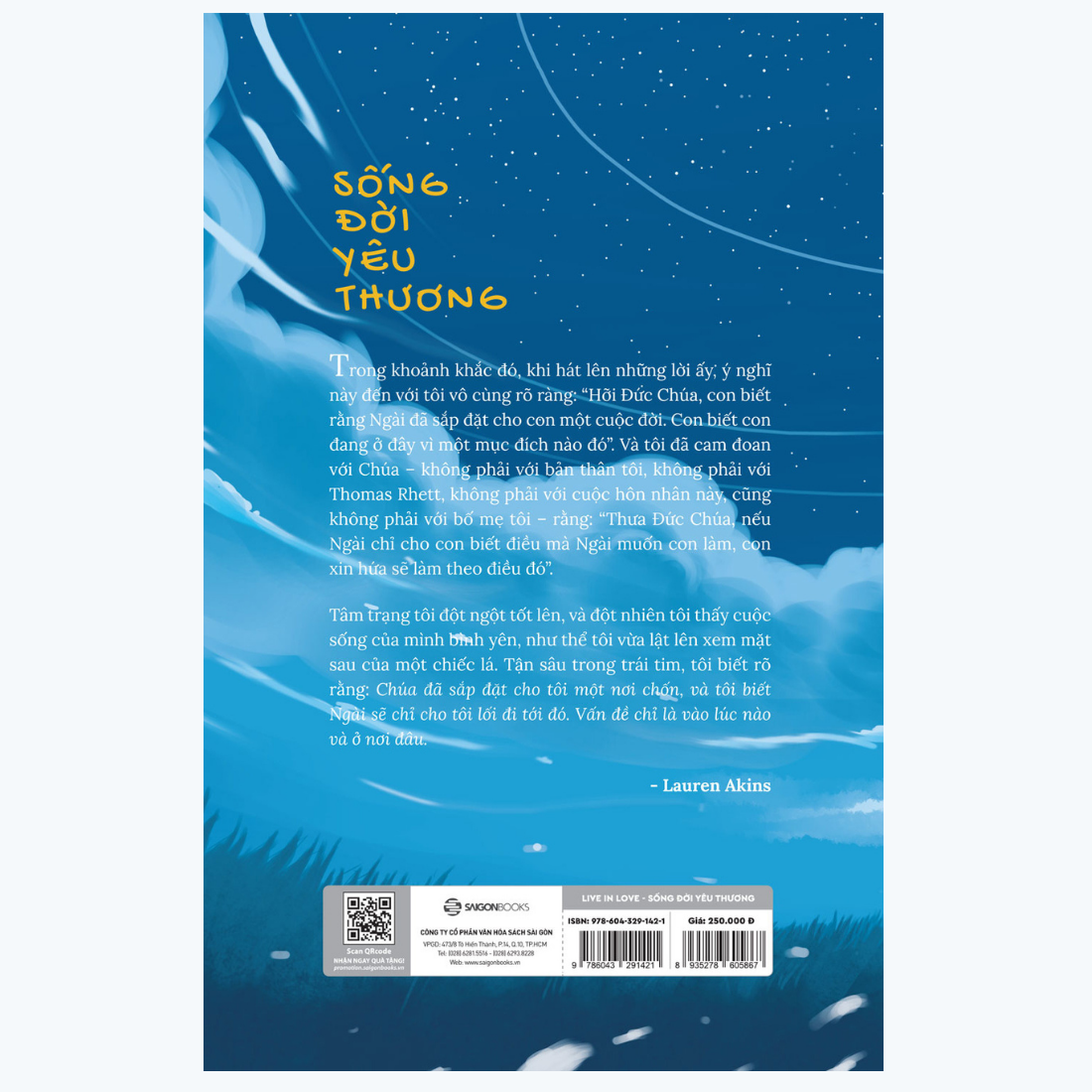 Lauren Akins không bao giờ muốn trở thành tâm điểm, nhưng khi Thomas Rhett biến mối quan hệ của mình với Lauren trở thành chủ đề trong nhiều bài hát nổi tiếng của anh ấy, cô ấy đã được chuyển sang vai trò của một trong những nổi tiếng của nước Mỹ. Được người hâm mộ yêu mến vì sự thoải mái và quyến rũ của cô ấy, làm việc nhân đạo và tình yêu trong sáng mà cô ấy dành cho gia đình, Lauren chưa bao giờ chia sẻ về câu chuyện của mình - đầy đủ như thể với tình yêu sâu sắc, mất mát đau thương , niềm vui to lớn và cuộc đấu tranh để giữ vững niềm tin trong suốt chặng đường này - cho đến bây giờ - trong Sống đời yêu thương.