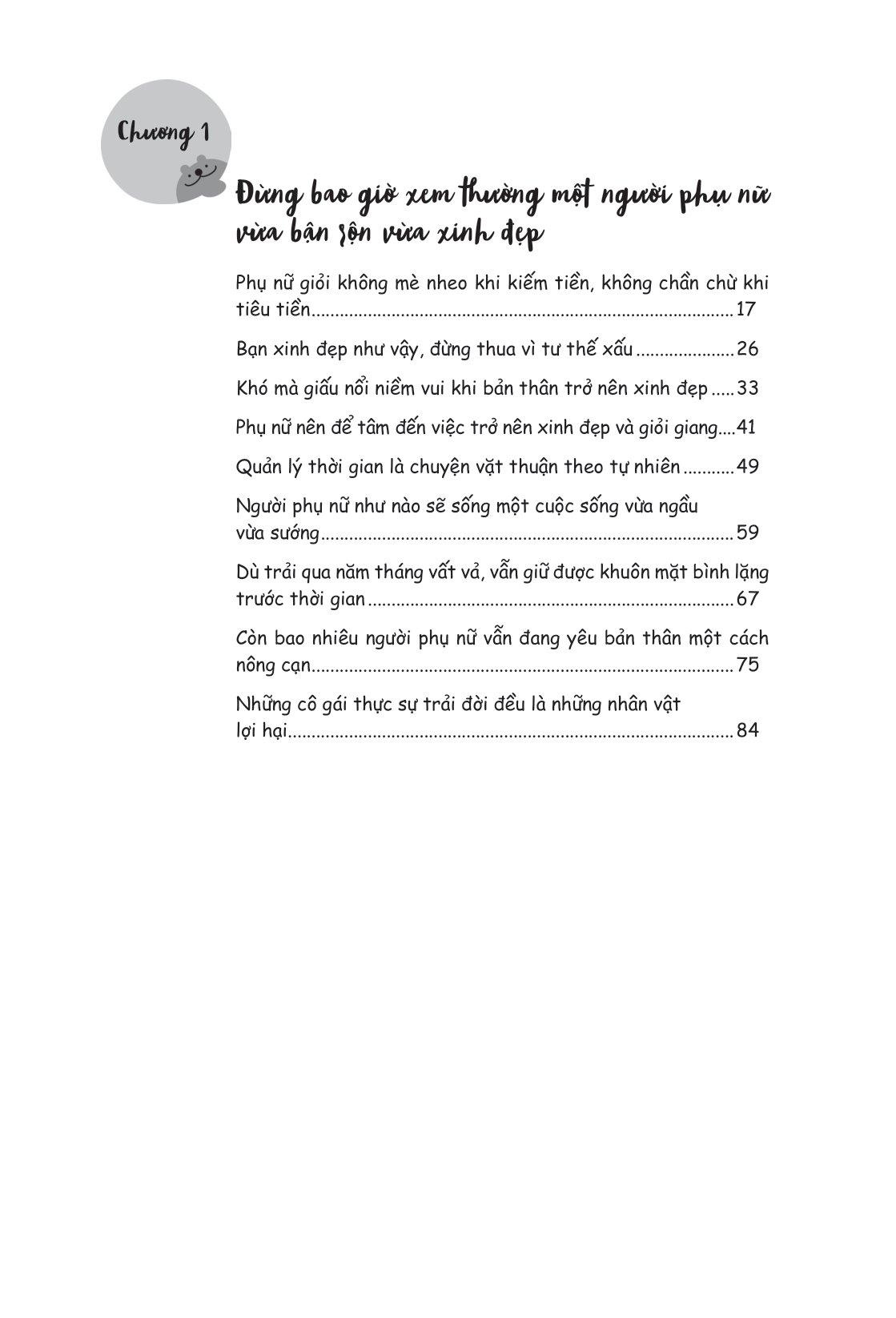 Cuốn sách như một bản tuyên ngôn cho những người phụ nữ muốn sống một cuộc đời m.ình mong muốn, được đúc kết lại bằng chính những câu chuyện để đời cùng trải nghiệm quý báu của tác giả Lương Sảng với 5 chương lớn: