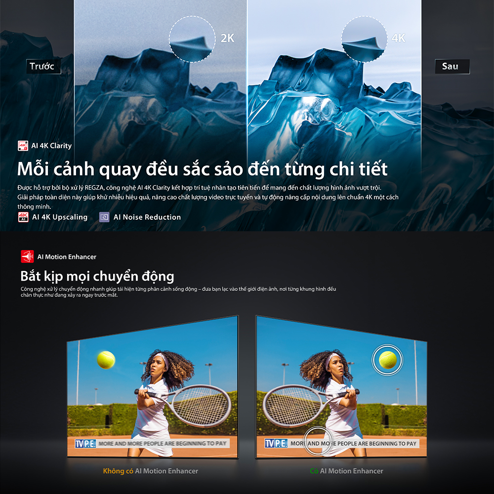 - Công nghê xử lý hình ảnh: Đồng bộ khung hình/tần số quét chơi game VRR, ALLM, AI Picture Optimizer, AI 4K Clarity, AI HDR Enhancer, AI Motion Enhancer, Game Deck