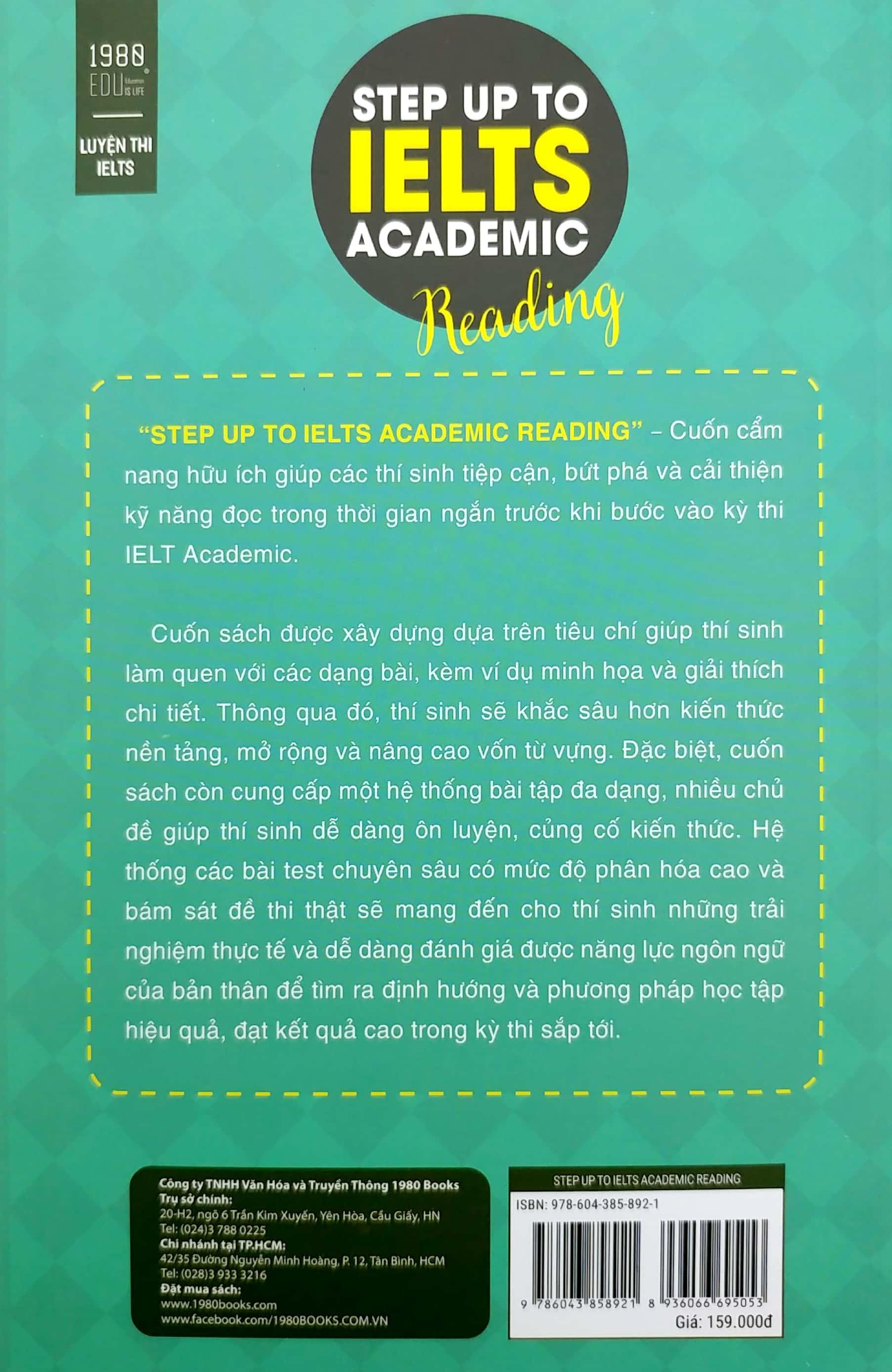 Cuốn sách nằm trong bộ sách “Step up to IELTS Academic” là bộ sách gồm bốn kỹ năng “listening/ speaking/ reading/ writing” được cô đọng kiến thức và hỗ trợ tối đa cho thí sinh trong việc làm quen dạng đề và nhận diện dạng bài. Đặc biệt là định hình và xây dựng thói quen, phương pháp học tập hiệu quả để hệ thống kiến thức, dành cho người mới bắt đầu và muốn ôn luyện chuyên sâu; tổng hợp đầy đủ nhất các dạng bài trong đề thi IELTS. Thí sính sẽ dễ dàng nắm bắt được trọng điểm kiến thức để học nhanh nhớ lâu. Hệ thống bài mẫu và ví dụ minh họa chi tiết giúp thí sinh dễ dàng hiểu và tránh được những lỗi sai thường gặp trong quá trình làm bài. Các mẹo hay, tips nhỏ giúp thí sinh có thêm kinh nghiệm khi chinh phục từng kỹ năng của bài thi IELTS. Bên cạnh việc cô đọng kiến thức, bộ sách còn giúp các thí sinh nâng cao vốn từ vựng hay làm quen với cách tính điểm, tiêu chí chấm của giám khảo để từ đó có chiến lược học tập thích hợp. Hệ thống bài tập, bài thi mẫu đa dạng nhiều chủ đề giúp thí sinh đa dạng hơn trong cách viết, rèn luyện kỹ năng nghe chuyên sâu, đọc hiểu nhanh hay xây dựng lập luận chặt chẽ đối với kỹ năng nói, thông qua đó tự đánh giá được năng lực ngoại ngữ của bản thân để có chiến lược học tập hiệu quả hơn.