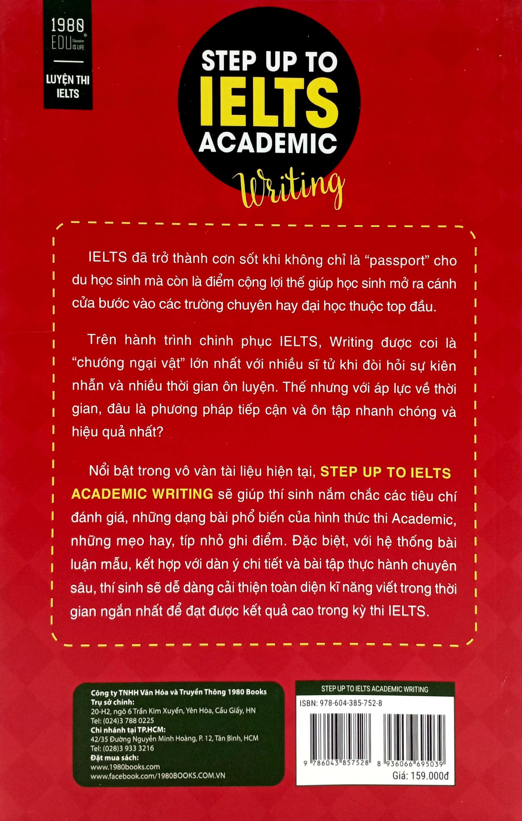 Cuốn sách nằm trong bộ sách “Step up to IELTS Academic” là bộ sách gồm bốn kỹ năng “listening/ speaking/ reading/ writing” được cô đọng kiến thức và hỗ trợ tối đa cho thí sinh trong việc làm quen dạng đề và nhận diện dạng bài. Đặc biệt là định hình và xây dựng thói quen, phương pháp học tập hiệu quả để hệ thống kiến thức, dành cho người mới bắt đầu và muốn ôn luyện chuyên sâu; tổng hợp đầy đủ nhất các dạng bài trong đề thi IELTS. Thí sính sẽ dễ dàng nắm bắt được trọng điểm kiến thức để học nhanh nhớ lâu. Hệ thống bài mẫu và ví dụ minh họa chi tiết giúp thí sinh dễ dàng hiểu và tránh được những lỗi sai thường gặp trong quá trình làm bài. Các mẹo hay, tips nhỏ giúp thí sinh có thêm kinh nghiệm khi chinh phục từng kỹ năng của bài thi IELTS. Bên cạnh việc cô đọng kiến thức, bộ sách còn giúp các thí sinh nâng cao vốn từ vựng hay làm quen với cách tính điểm, tiêu chí chấm của giám khảo để từ đó có chiến lược học tập thích hợp. Hệ thống bài tập, bài thi mẫu đa dạng nhiều chủ đề giúp thí sinh đa dạng hơn trong cách viết, rèn luyện kỹ năng nghe chuyên sâu, đọc hiểu nhanh hay xây dựng lập luận chặt chẽ đối với kỹ năng nói, thông qua đó tự đánh giá được năng lực ngoại ngữ của bản thân để có chiến lược học tập hiệu quả hơn.