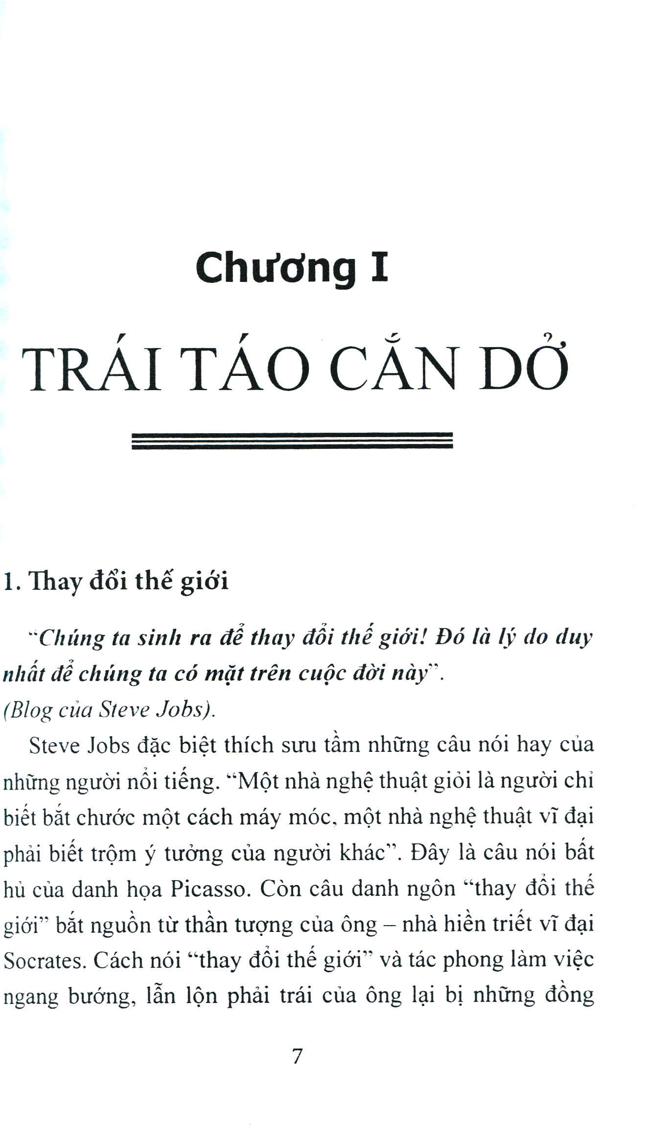 Cuốn sách khắc hoạ rõ ràng về cuộc đời, những thành công cũng như thất bại của Steve Jobs, qua đó bạn sẽ rút ra được những bài học, những châm ngôn sống. Steve Jobs đã thể hiện được kỹ thuật hiện đại bằng những tác phẩm đầy tính sáng tạo của mình. Và chính ông đã làm thế giới của chúng ta ngày càng tốt đẹp hơn. Trong cuộc đời và sự nghiệp của mình, Steve Jobs đã để lại cho thế giới những bài học, lời khuyên quý báu.