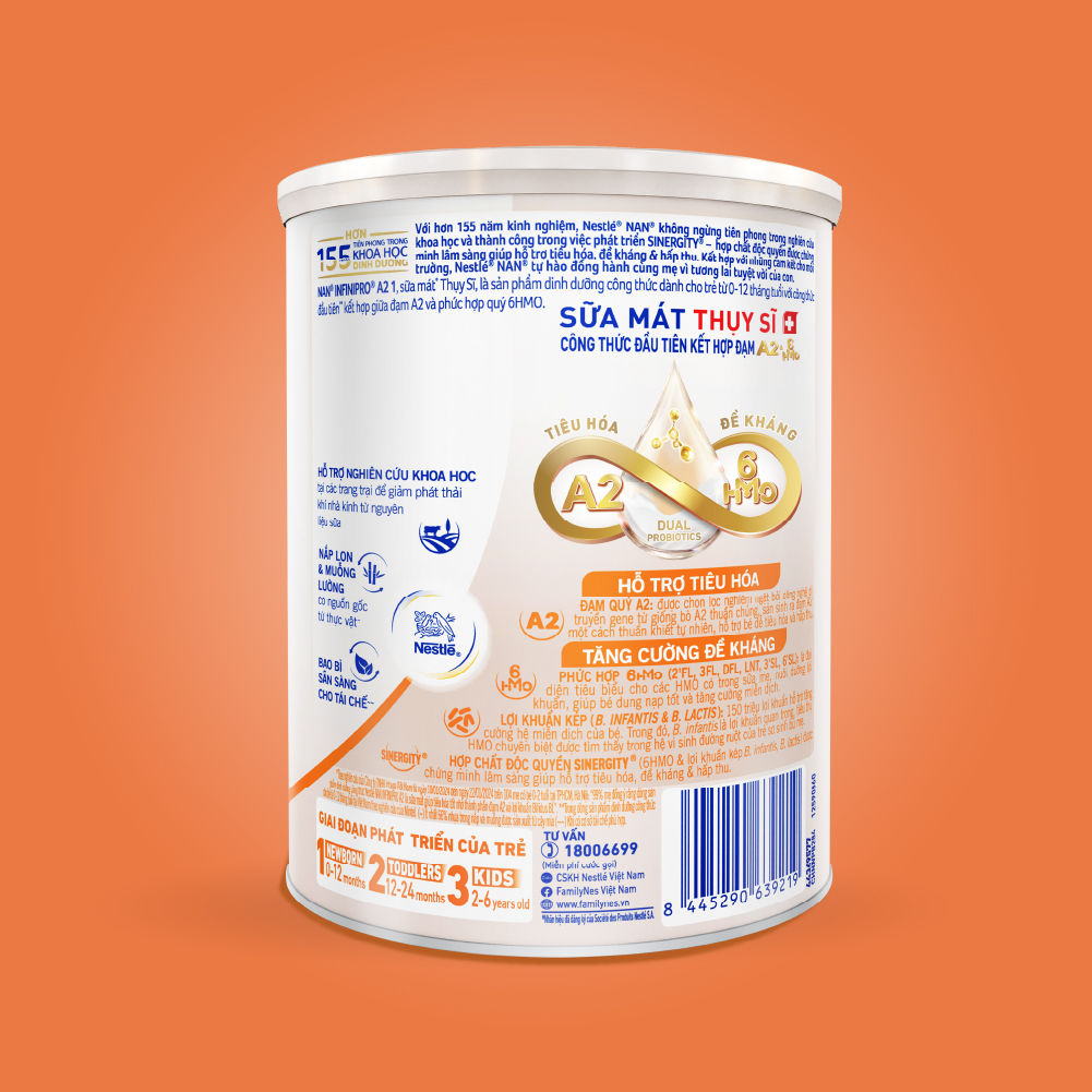 Thành phần: LACTOSE (từ SỮA-from MILK), Hỗn hợp dầu (dầu hướng dương giàu acid Oleic, dầu hạt cải có hàm lượng acid Erucic thấp, dầu hướng dương, dầu nấm Mortierella alpina, dầu vi tảo Schizochytrium sp., chất chống oxy hóa (Tocopherol concentrat dạng hỗn hợp, Ascorbyl palmitat)), WHEY khử khoáng (từ SỮA-WHEY PROTEIN from MILK), SỮA A2 tách kem 11% (A2 Skimmed MILK powder), Các khoáng chất (Calci citrat, Kali citrat, Kali Clorid, Magnesi Clorid, Natri citrat, Dikali hydro phosphat, Natri clorid, Sắt (II) sulphat, Kẽm sulfat, Đồng sulfat, Mangan sulfat, Kali iodid, Natri selenat), Các vitamin (C, B5, Nicotinamid, B2, A, B1, B6, K1, Acid folic, Biotin, D3, B12), Oligosaccharide (2'-Fucosyllactose, Lacto-N-tetraose, 3-Fucosyllactose, 6'-Sialyllactose, Difucosyllactose, 3'-Sialyllactose), Maltodextrin, Chất nhũ hóa Lecithin ĐẬU NÀNH (SOYA lecithin), Choline Bitartrate, L-Phenylalanine, Inositol, Taurine, Lợi khuẩn (Bifidobacterium longum subsp. infantis, Bifidobacterium lactis), L-Histidine, Nucleotide (Uridine, Cytidine, Adenosine, Guanosine), L-Carnitine, Chất điều chỉnh độ acid Acid citric.