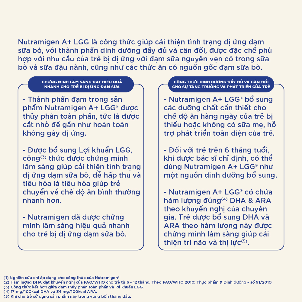 - Sữa bột Nutramigen A+ LGG được chứng minh lâm sàng về tính an toàn & hiệu quả trong kiểm soát dị ứng đạm sữa bò qua hơn 70 năm nghiên cứu lâm sàng.