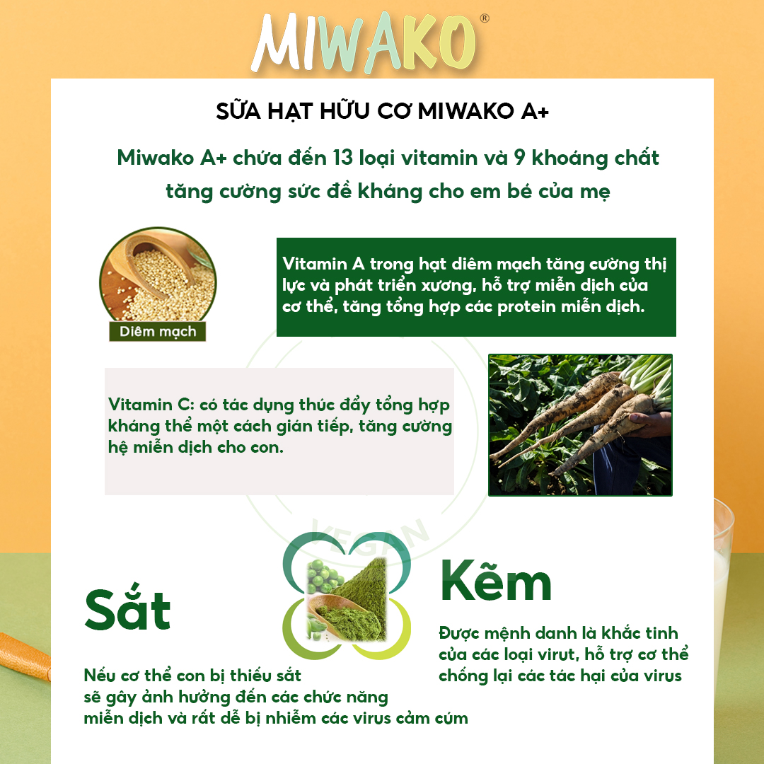 Combo 4 Hộp 400g Sữa Công Thức Hữu Cơ Miwako A+ Vị Vani, Sữa Hạt Cho Bé Phát Triển Trí Não Chiều Cao THÔNG TIN SẢN PHẨM SỮA HẠT MIWAKO A+, SỮA HỮU CƠ CHO