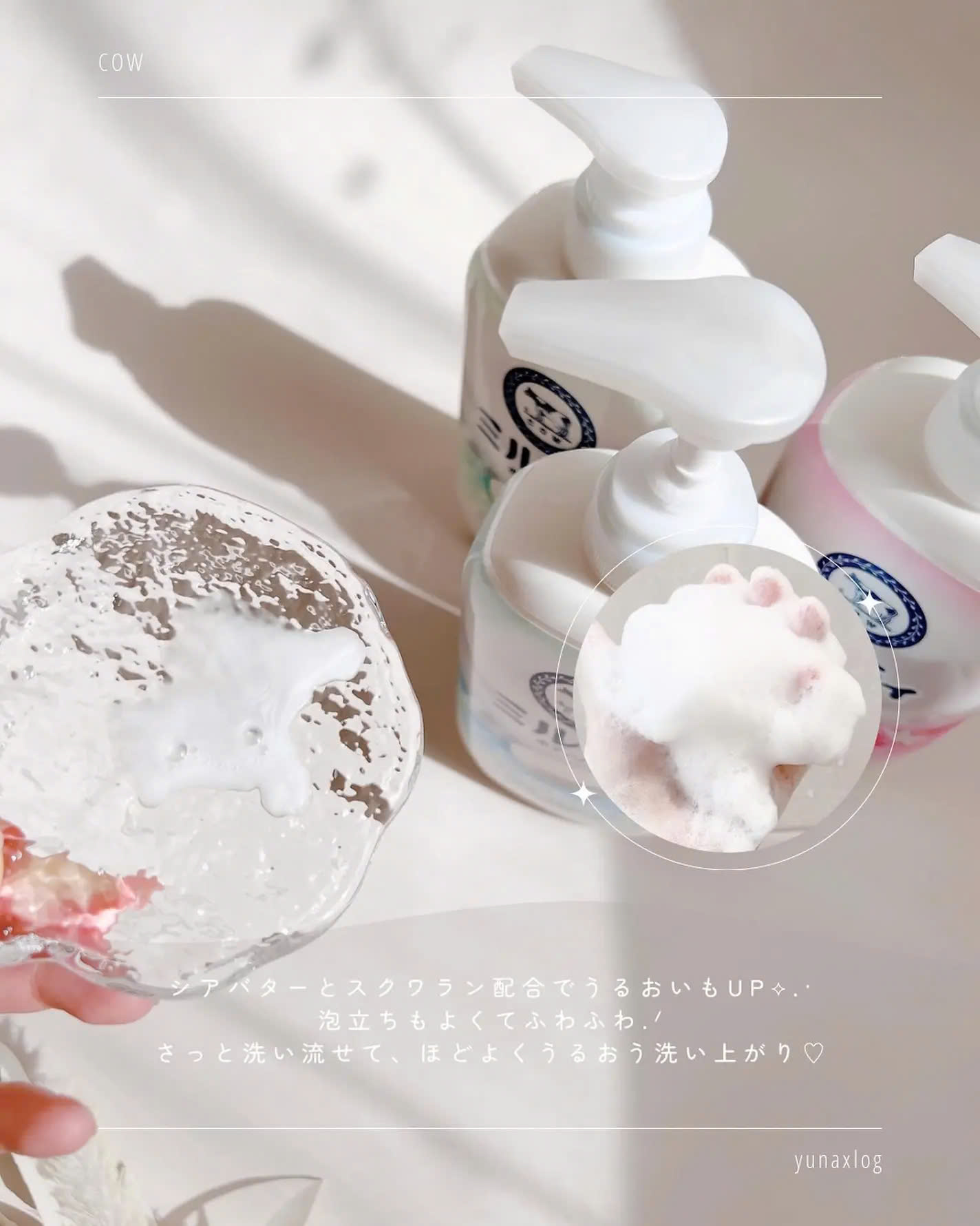 Sữa tắm Tạo Bọt chiết xuất từ SỮA BÒ TƯƠI TÁCH BÉO VÀ VÁNG SỮA được thu hoạch trong các nông trại tại Nhật. Trong váng sữa và sữa tách béo có chứa Axit Lactic, Các Enzim, Protein Và Rất Nhiều Vitamin A, B12... có tác dụng cực kì hiệu quả trong việc dưỡng sáng da và cải thiện các vấn đề về da như: sạm màu, vết thâm, mụn.. *HƯƠNG THƠM HOA CỎ VÀ SỮA BÒ DỊU NHẸ lưu giữ suốt cả ngày.