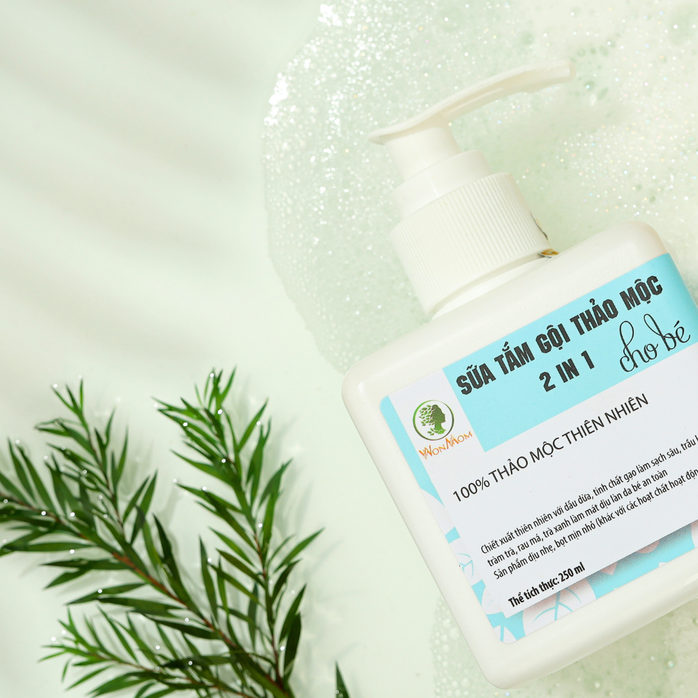 - Sữa tắm và gội cho bé Wonmom với nguyên liệu thảo mộc thiên nhiên: dầu dừa, tinh chất gạo, trầu không, tràm trà, rau má, trà xanh. ️ Đặc biệt, sản phẩm dịu nhẹ, bọt mịn nhỏ, không làm cay mắt bé nên an toàn cho bé yêu!