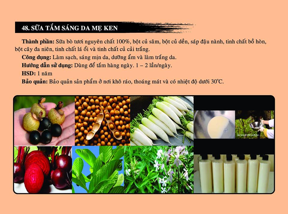 SỮA TẮM SÁNG DA MẸ KEN Tất cả được chiết xuất từ Thiên Nhiên.Thơm nhẹ nhàng mùi sữa bò, mùi lá ổùi nghệ mùi sáp đậu nành, sữa bò tươi (bò được nuôi tại trang