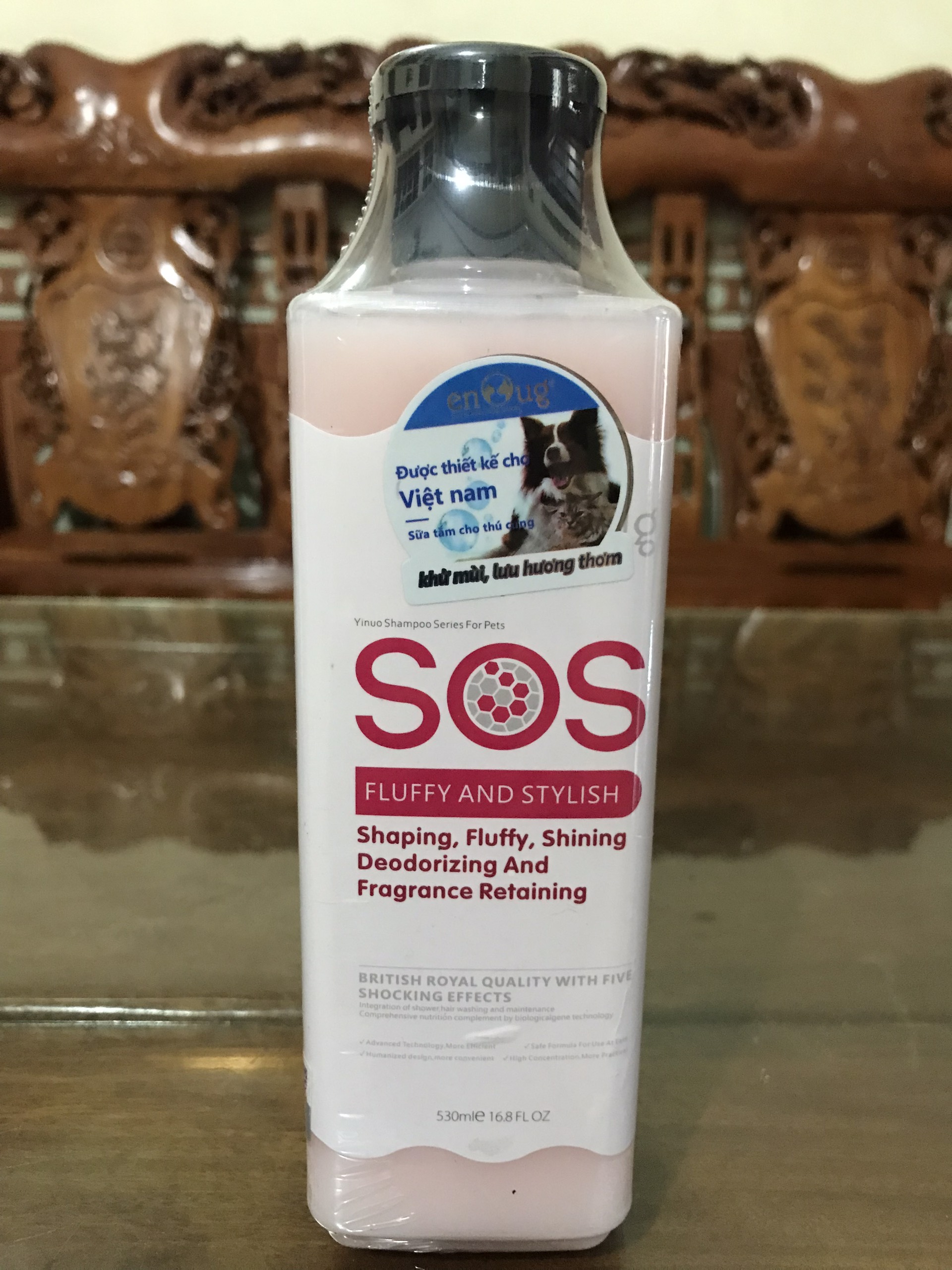 SỮA TẮM CHÓ MÈO SOS 530ml có nhãn được thiết kế cho thị trường Việt Nam - Công dụng của sữa tắm chó mèo SOS: làm sáng màu lông, loại bỏ bụi bẩn, khử mùi,