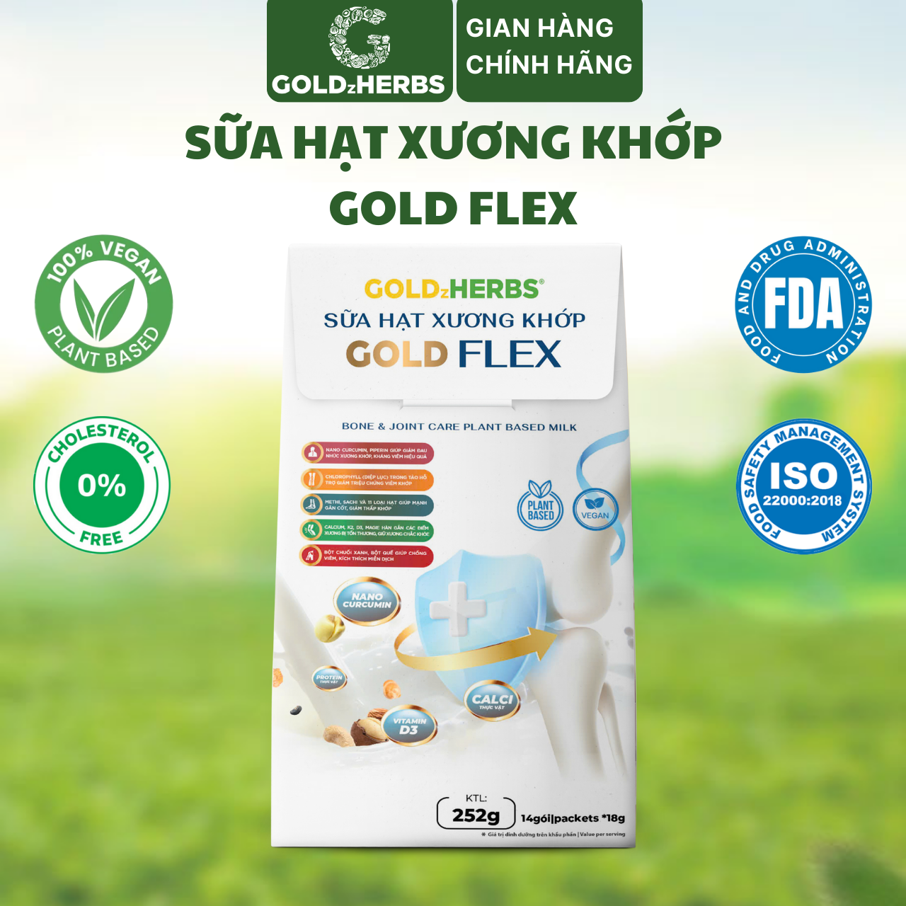 Sữa thực vật xương khớp Gold Flex CÔNG DỤNG - Tăng cường sức khỏe xương khớp. - Cung cấp canxi, giảm loãng xương. - Hỗ trợ kháng viêm, giảm đau. - Cải thiện linh hoạt