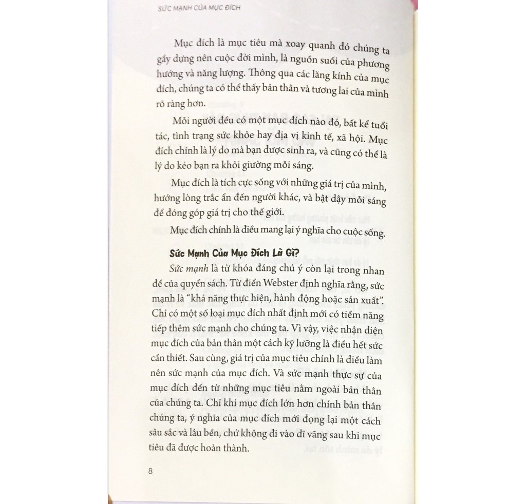 Trong cuộc sống này, ai trong chúng ta cũng muốn tìm ra mục đích sống của riêng mình. Mục đích là nền tảng và ý nghĩa của cuộc sống. Mục đích không chỉ tiếp thêm nghị lực sống, mà còn giúp chúng ta sống lâu hơn, tốt đẹp hơn. Mục đích vốn không phải là một khái niệm xa vời mà nằm ngay trong bản thân mỗi con người, đang chờ được khám phá.