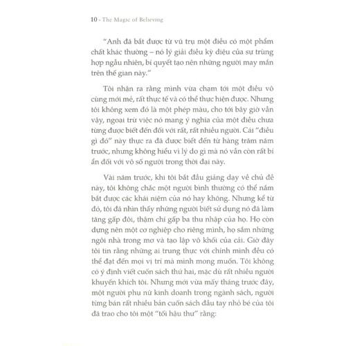 Sức mạnh niềm tin của Claude M. Bristol sẽ mang lại cho bạn đọc sự khích lệ và hỗ trợ mà các bạn đang cần. Nó chỉ ra một cách hết sức đơn giản nhưng đầy thuyết phục rằng phép ám thị luôn luôn có thể được sử dụng để cải thiện hiệu quả của bất kỳ công việc nào. Nó giải phóng mọi tiềm năng và giúp chúng ta tin ở chính mình, đó cũng là một kho bí quyết đầy hiệu quả để phát triển và nuôi dưỡng niềm tin ấy. Chẳng hạn, Bristol kể lại rằng ông thường vẽ nhanh ký hiệu đồng đô-la trên bất cứ mẩu giấy lớn nhỏ nào xuất hiện trên bàn ông. Nghe thật lạ lùng phải không bạn? Vâng, đó không phải là một bài tập luyện trí nhớ, mà là một phương pháp tưởng tượng có tính toán nhằm mục đích gia tăng sức mạnh của niềm tin.
