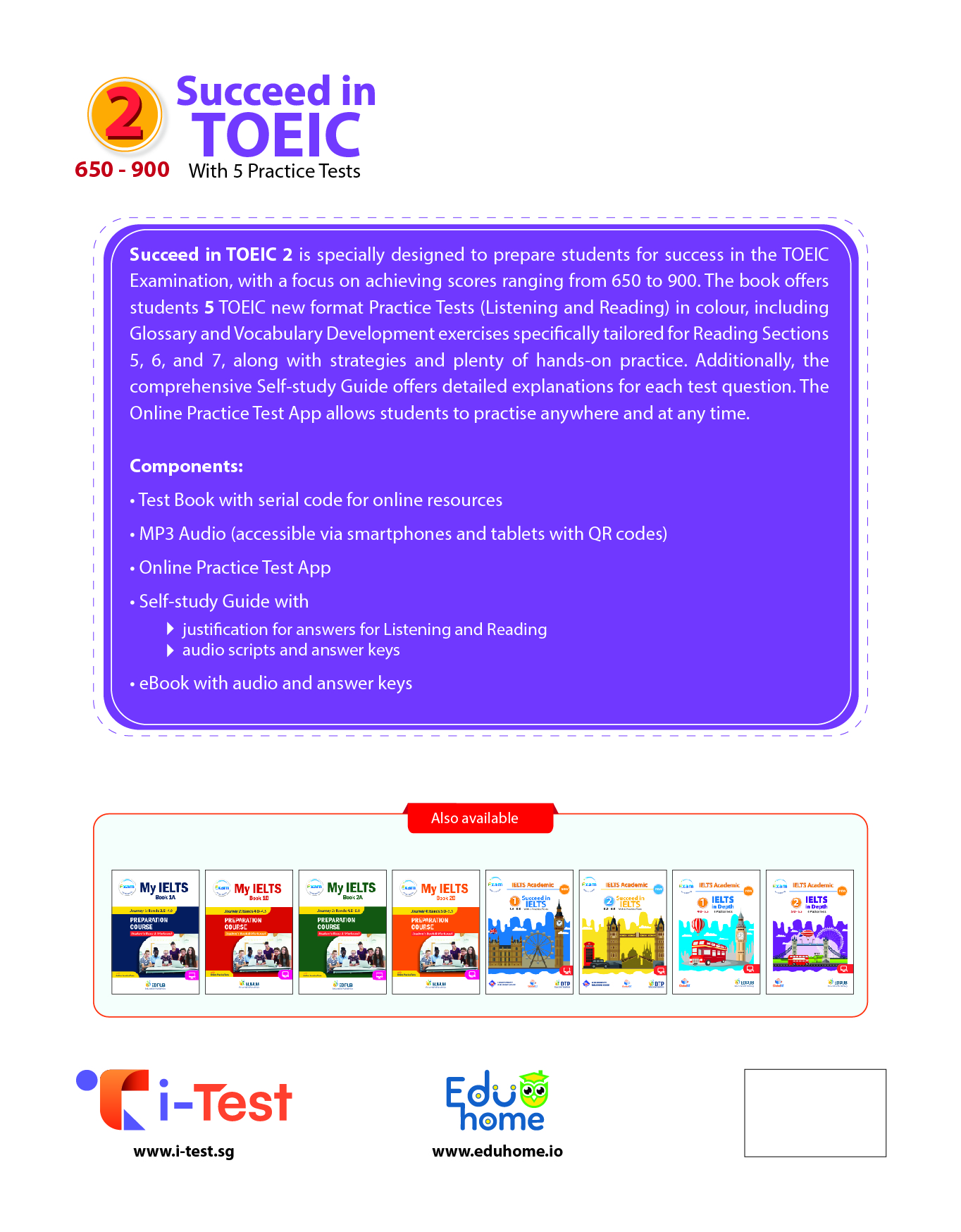 Mua tại TiktokSucceed in TOEIC is specially designed to prepare students for success in the TOEIC Examination, with a focus on achieving scores ranging from 550 to 750 and 650 to 900. The book offers students 6 TOEIC new format Practice Tests (Listening and Reading) per level in colour, including Glossary and Vocabulary Development exercises specifically tailored for Reading Sections 5, 6, and 7, along with strategies and plenty of hands-on practice. Additionally, the comprehensive Self-study Guide offers detailed explanations for each test question. The Online Practice Test App allows students to practise anywhere and at any time.