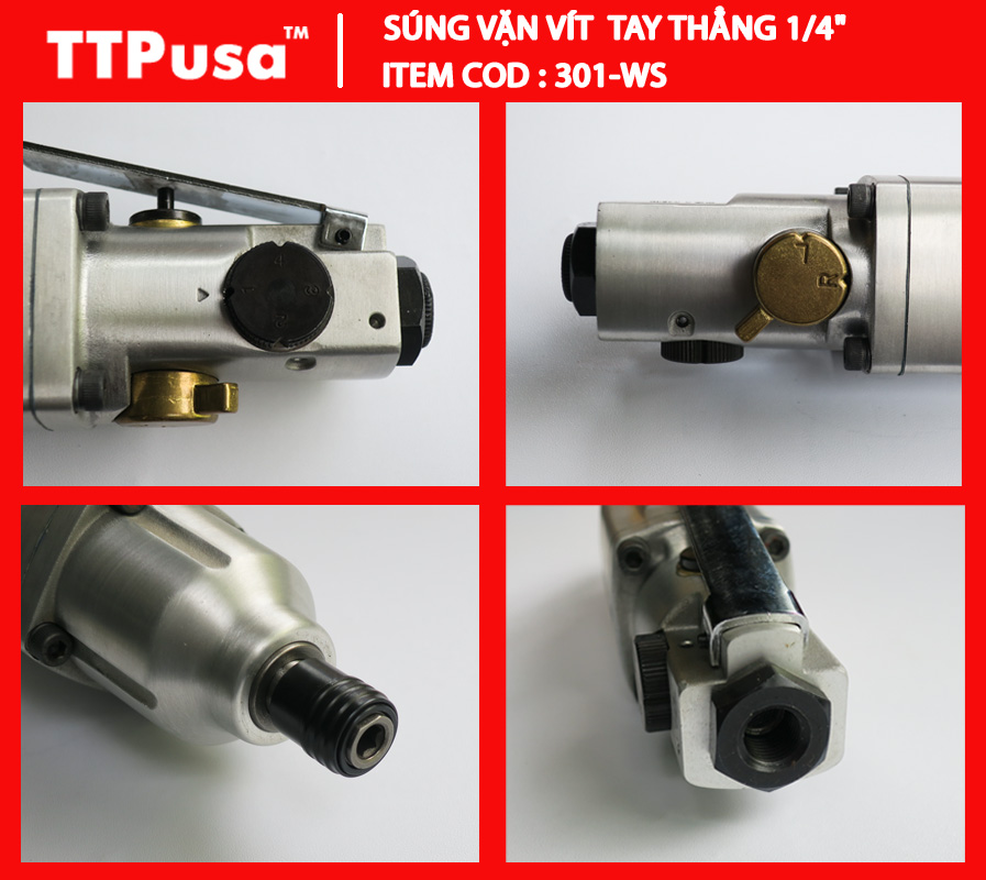• Súng vặn vít thẳng 1/4" TTPusa 301-WS chuyên dùng để vặn ốc vít để lắp ráp hay để khoan. Súng vặn vít TTPusa không dùng điện mà dùng khí nén tạo ra từ máy nén khí. Rất thích hợp các tiệm sửa chữa, bảo trì và nhà máy xí nghiệp.