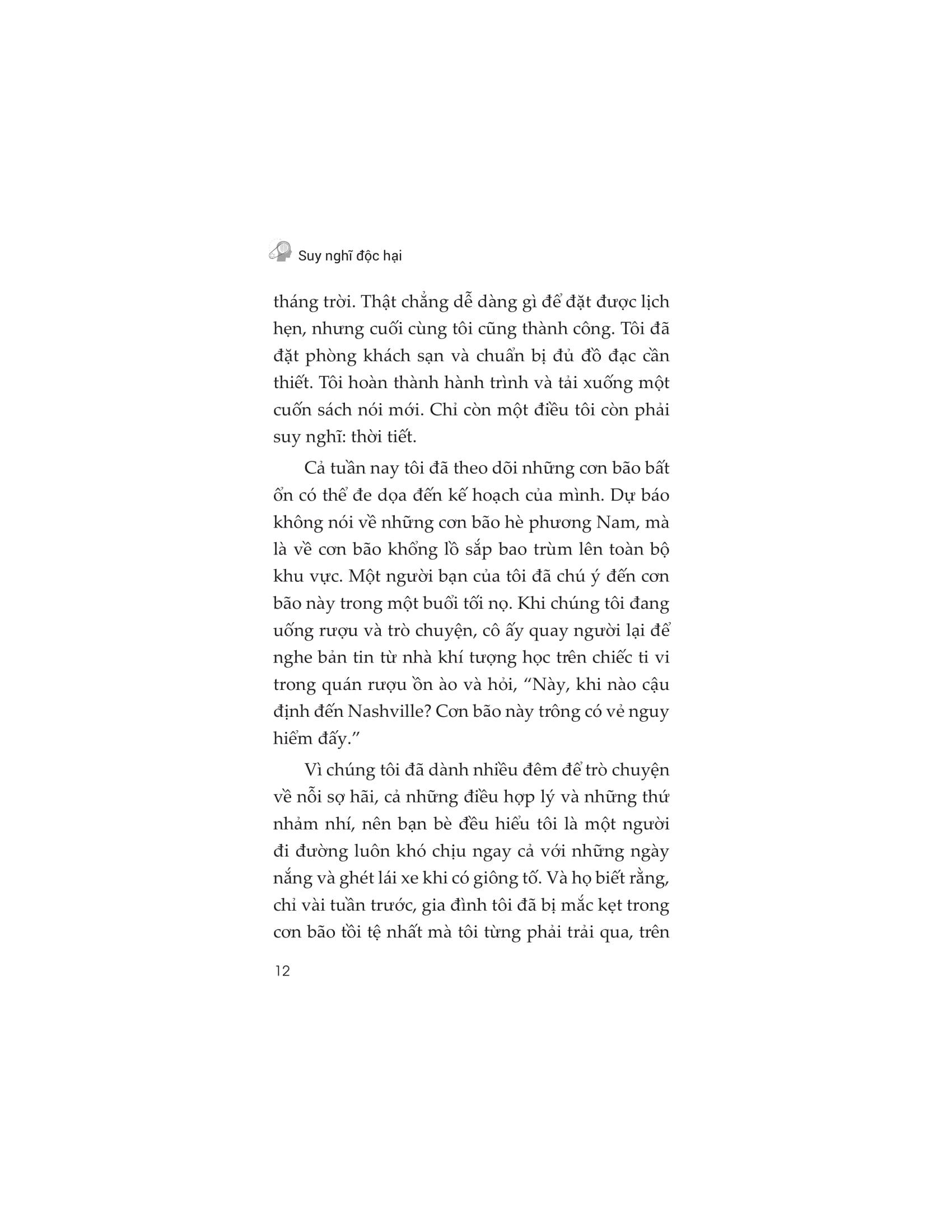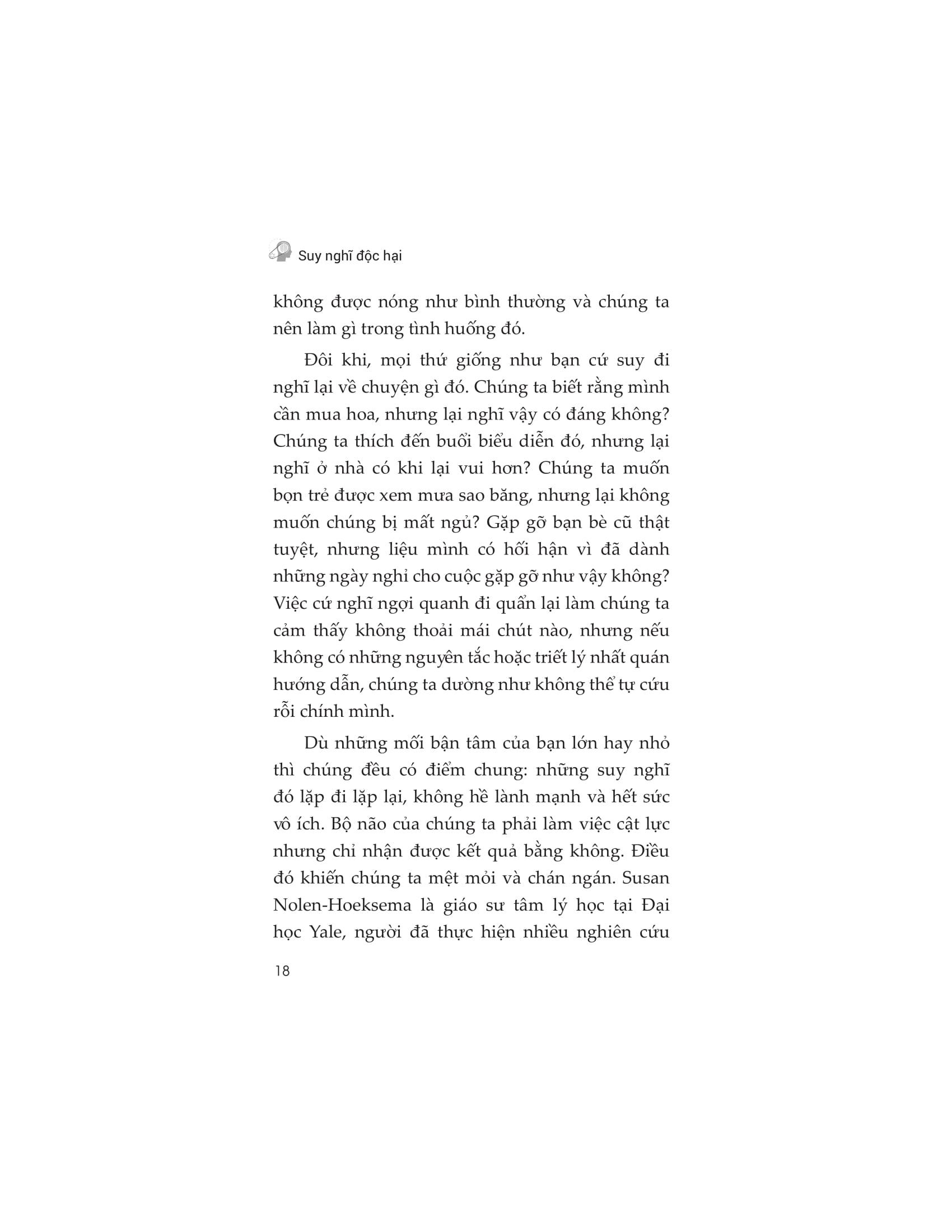 thể xảy ra trong tương lai. Việc cứ nghĩ ngợi quanh đi quẩn lại làm chúng ta cảm thấy không thoải mái chút nào, nhưng nếu không có những nguyên tắc hoặc triết lý nhất quán hướng dẫn, chúng ta dường như không thể tự cứu rỗi chính mình. Dù những mối bận tâm của bạn lớn hay nhỏ thì chúng đều có điểm chung: những suy nghĩ đó lặp đi lặp lại, không hề lành mạnh và hết sức vô ích.