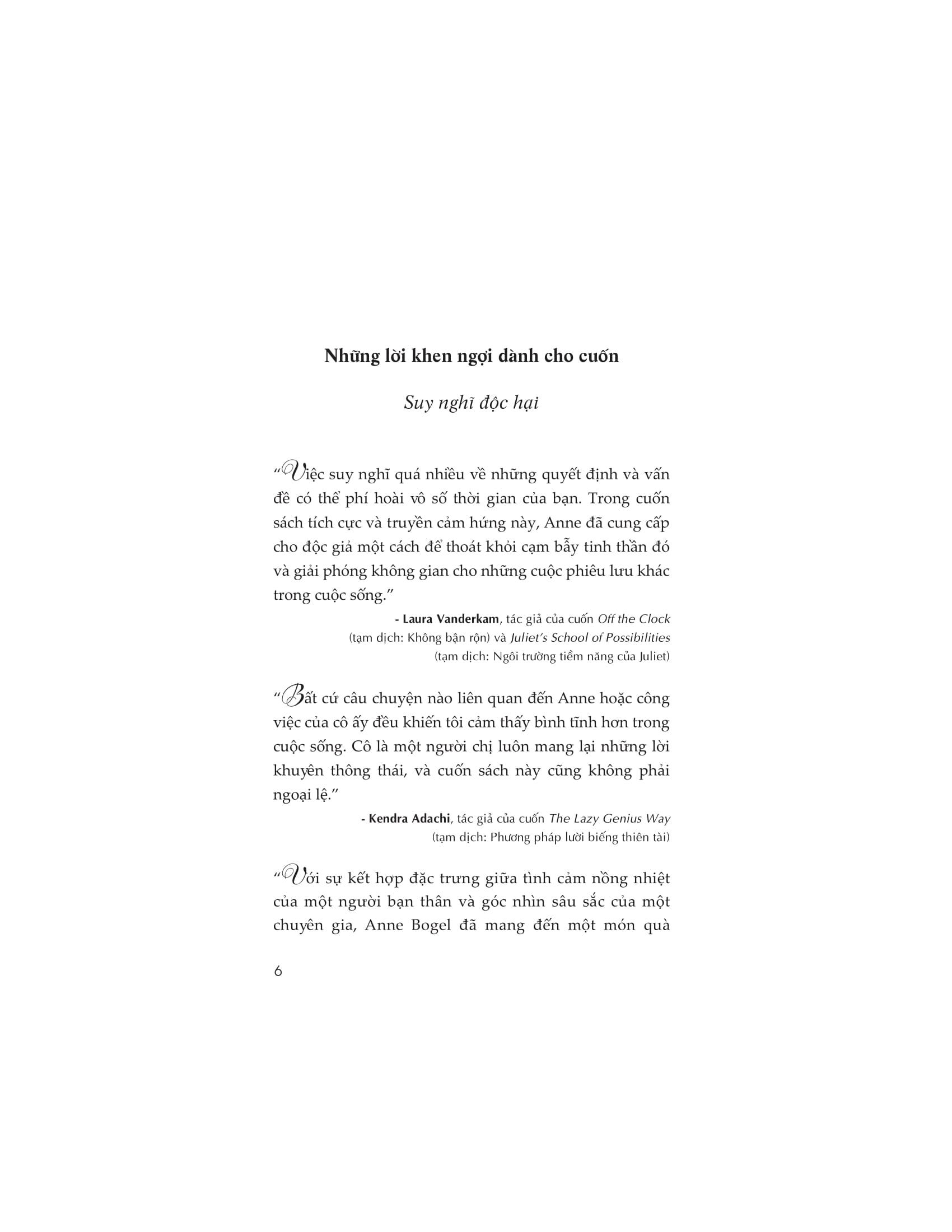 “Việc suy nghĩ quá nhiều về những quyết định và vấn đề có thể phí hoài vô số thời gian của bạn. Trong cuốn sách tích cực và truyền cảm hứng này, Anne đã cung cấp cho độc giả một cách để thoát khỏi cạm bẫy tinh thần đó và giải phóng không gian cho những cuộc phiêu lưu khác trong cuộc sống.”