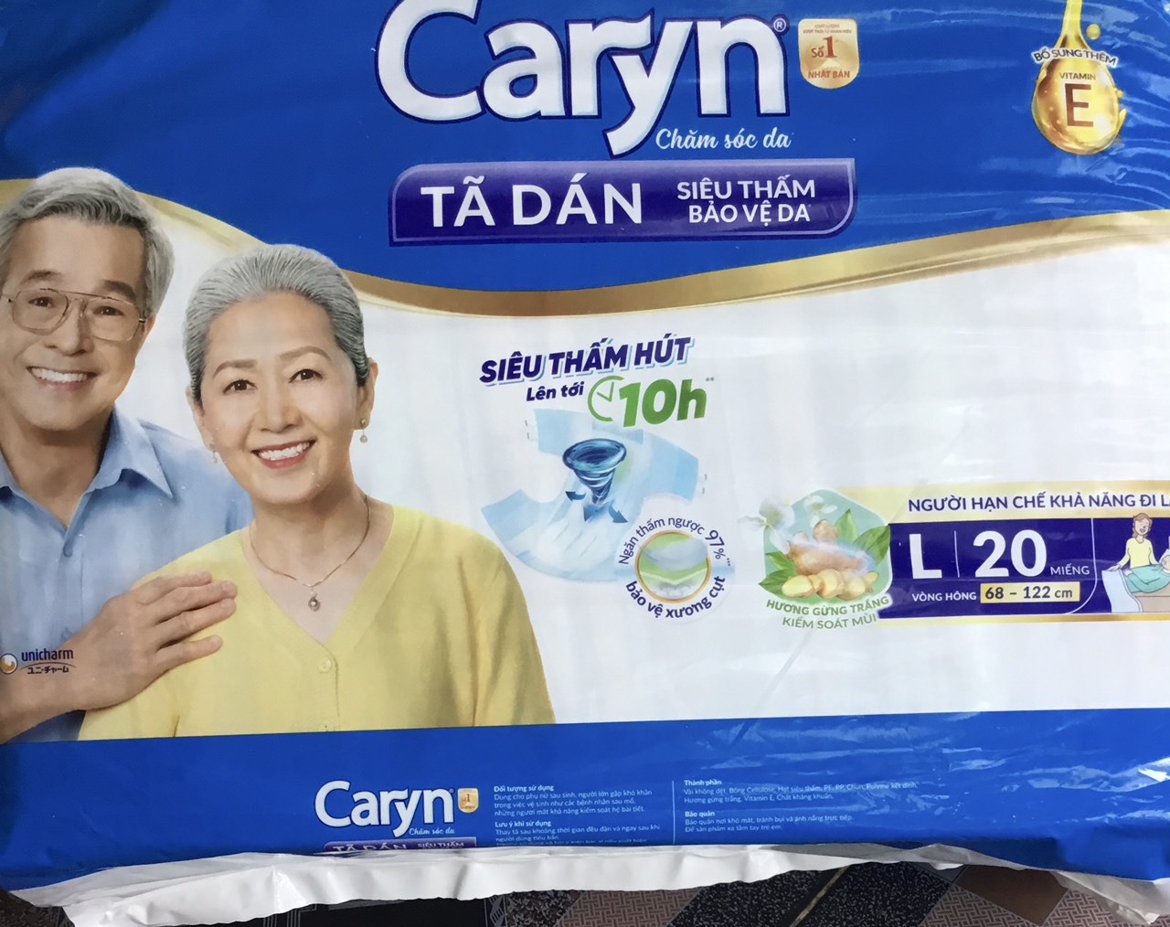 Hướng dẫn sử dụng - Mặc với sự trợ giúp của người nhà 1. Nghiêng người dùng sang bên, trải dọc miếng tã theo cơ thể người dùng 2. Xoay người dùng về tư thế nằm, căn chỉnh lại miếng tã cho vừa vặn 3. Kéo phần trước của miếng tã qua chân lên ngang bụng 4. Mở phần khóa dính, dán chéo vào nùng nilon có logo Caryn. Lưu ý, tay giữ vào phần màu xanh để giữ độ bám dính của khóa 5. Dán khóa dính 4 góc sao cho miếng tã ôm sát vào cơ thể người dùng. Điều chỉnh thêm phần mép miếng tã ôm sát đùi Lưu ý: Thay tã sau khoảng thời gian đều đặn và ngay sau khi người dùng tiêu bẩn Ngừng sử dụng và hỏi ý kiến bác sĩ nếu xuất hiện bất thường trên da