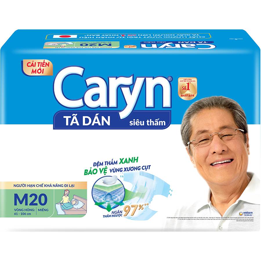 Tã dán Người Cao Tuổi Caryn Size M20 Siêu thấm Đệm thấm xanh bảo vệ vùng xương cụt (20 Miếng) Tã dán Siêu thấm Caryn cải tiến mới với "Đệm thấm xanh" bảo vệ vùng xương cụt,