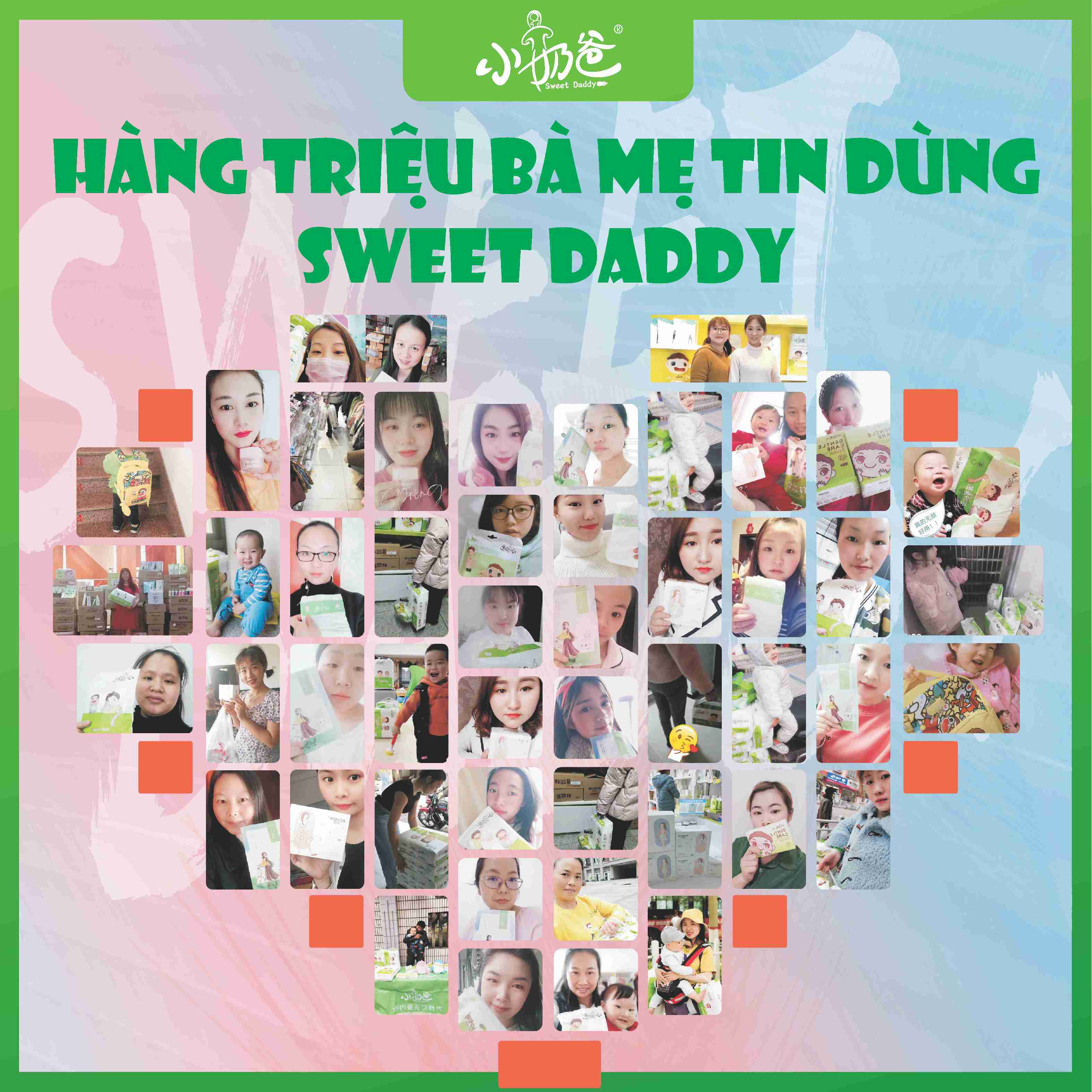 - Sweet Daddy là chuỗi thương hiệu Mẹ&Bé TOP 10 tại Trung Quốc, đã có hơn 1000 cửa hàng khắp đại lục và là nhà máy chuyên nghiên cứu, sản xuất các sản phẩm tã bỉm, khăn vệ sinh, các loại kem dưỡng ẩm, sửa tắm...với mục tiêu không chỉ tiết kiệm tiền cho các bà Mẹ mà còn đồng hành cùng sự phát triển khoẻ mạnh của con.