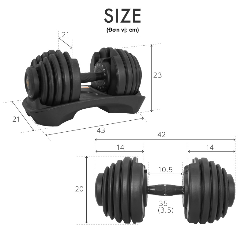 Thông tin chi tiết về sản phẩm bộ tạ tay khóa số 24kg cao cấp Dumbbel Đại Nam Sport. - Màu sắc: Đen - Kích thước: Dài x rộng x cao = 43 x 21