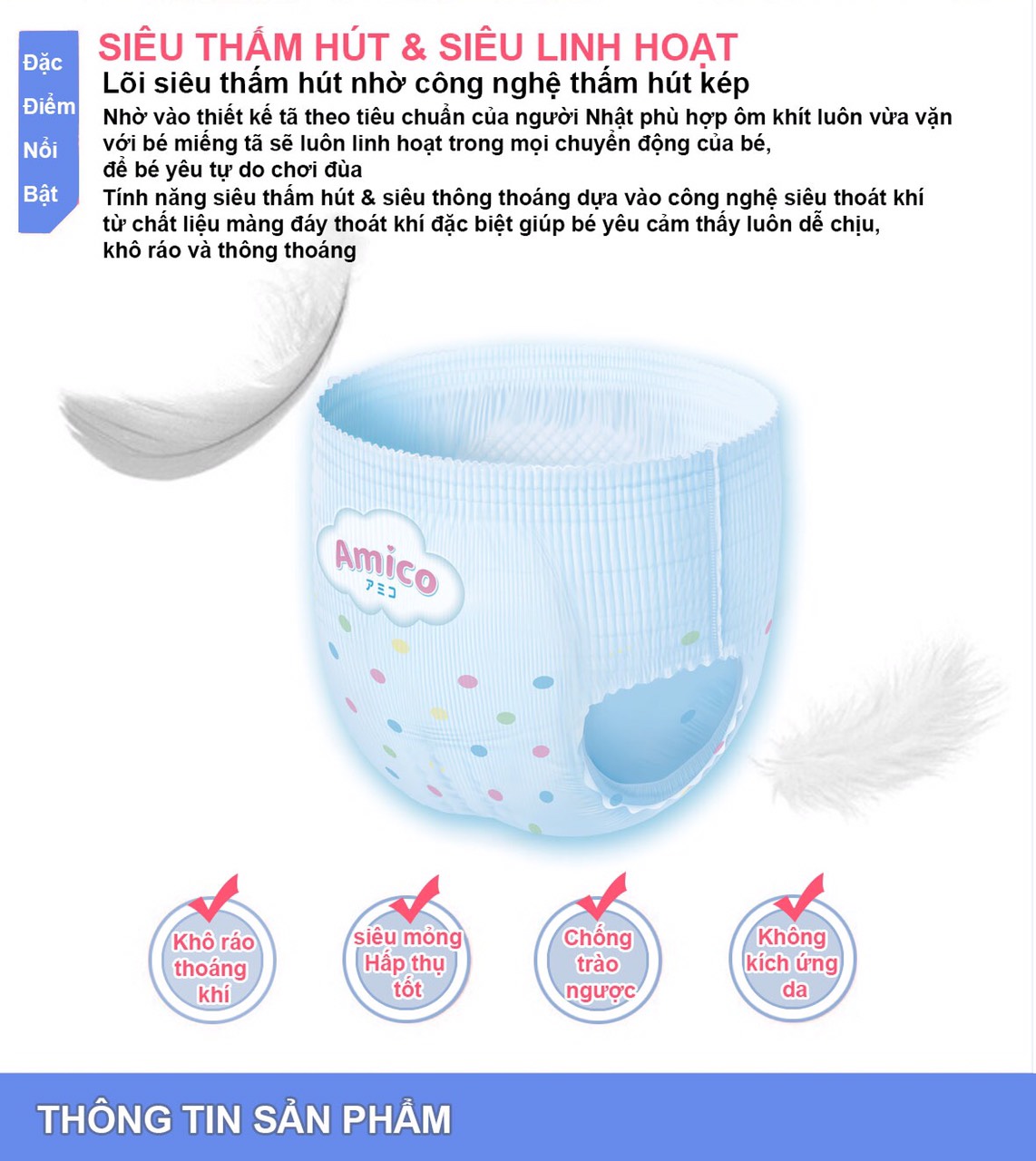 Mua tại TiktokTã giấy cao cấp AMICO là thương hiệu tại Nhật nội địa đến với Việt Nam sau Merries, Moony,Genki, Goon… nhưng mang lại rất nhiều cảm tình của các mẹ Việt với giá thành hấp dẫn cùng bao bì đóng gói thêm miếng vô cùng tiết kiệm. Mình cùng khám phá xem sản phẩm này có những ưu điểm gì mà lại được các Mẹ Việt đang “săn lùng” nhiều đến thế nhé! Trong hàng ngàn sản phẩm và hàng trăm thương hiệu tã giấy khác nhau dành cho con yêu, các Mẹ hẳn rất lúng túng và gặp rất nhiều khó khăn khi chọn lựa và quyết định dùng tã bỉm nào phù hợp, nhất là với những người lần đầu làm Mẹ. Tã giấy cao cấp AMICO được nghiên cứu và với quy trình chọn lọc bông kỹ càng cùng xử lý bằng công nghệ tiên tiến tại nhà máy ở Nhật, tã giấy AMICO được đánh giá là sản phẩm đảm bảo được sự an toàn cho làn da mỏng manh nhạy cảm của bé ngay từ độ tuổi sơ sinh. Tã giấy AMICO được sản xuất hoàn toàn từ vật liệu tự nhiên, thân thiện với da đến 90% từ bông cho trẻ sơ sinh size NB90+6, nhưng khi lớn lên một chút, sản phẩm bông nhiều sẽ làm bé yêu của bạn nóng hơn vì vậy tã AMICO giảm chất liệu bông chỉ còn trên bề mặt, thay vào đó tập trung điểm mạnh được ghi nhận nhiều nhất ở sản phẩm cho bé là đặc tính thấm hút nhanh, cực tốt, chống tràn và chống hăm tã, thiết kế ôm sát đều vòng háng của bé mà không gây khó chịu, ngược lại, còn khiến bé yêu của Mẹ thích mê…