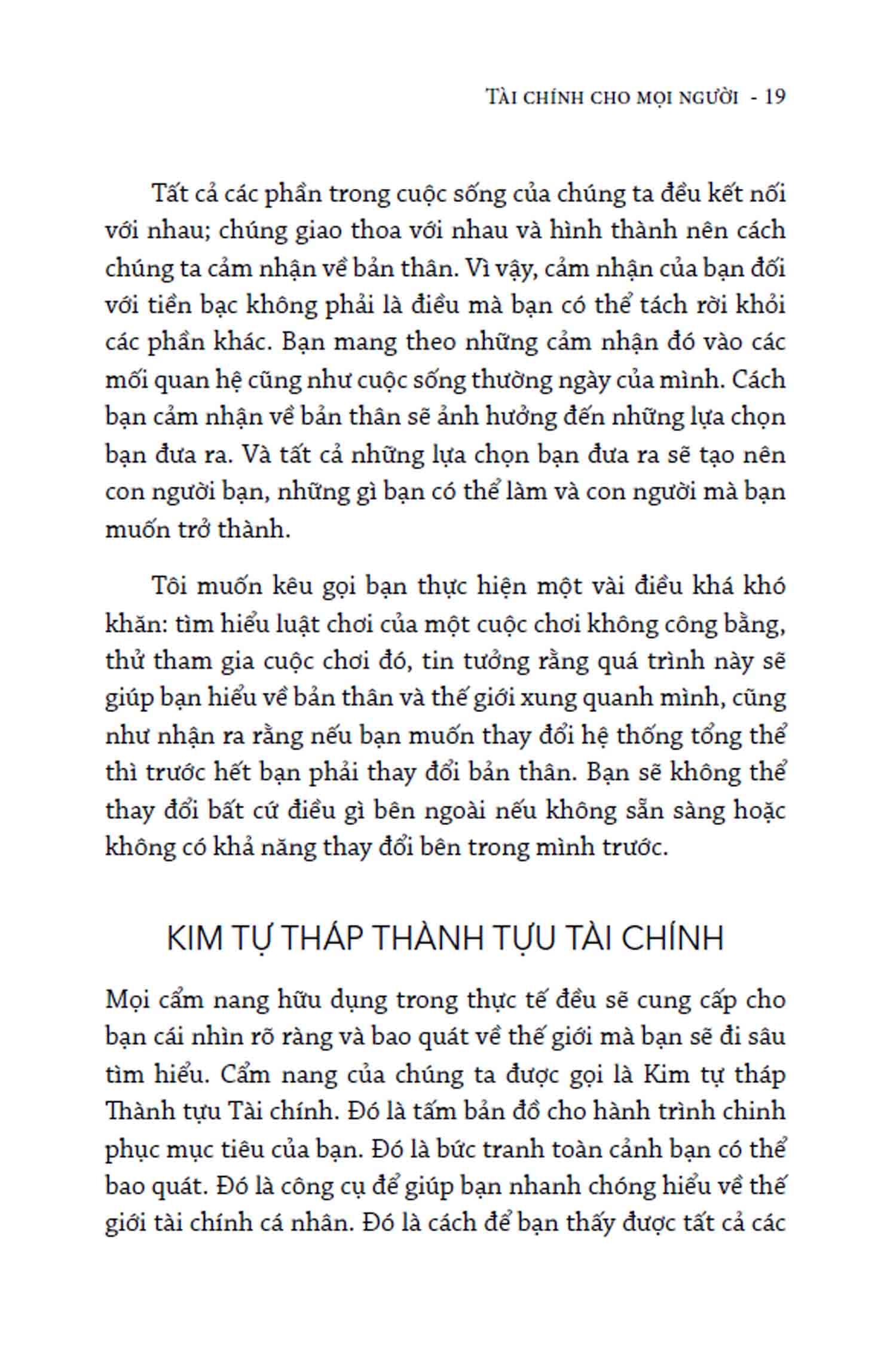Sách được chia thành 5 phần, mỗi phần tương ứng với một “tầng gạch” trong kim tự tháp tài chính cá nhân, cái mà mỗi người cần chinh phục theo thứ tự từ cơ bản đến nâng cao để đạt đến “đỉnh” thành tựu tài chính.