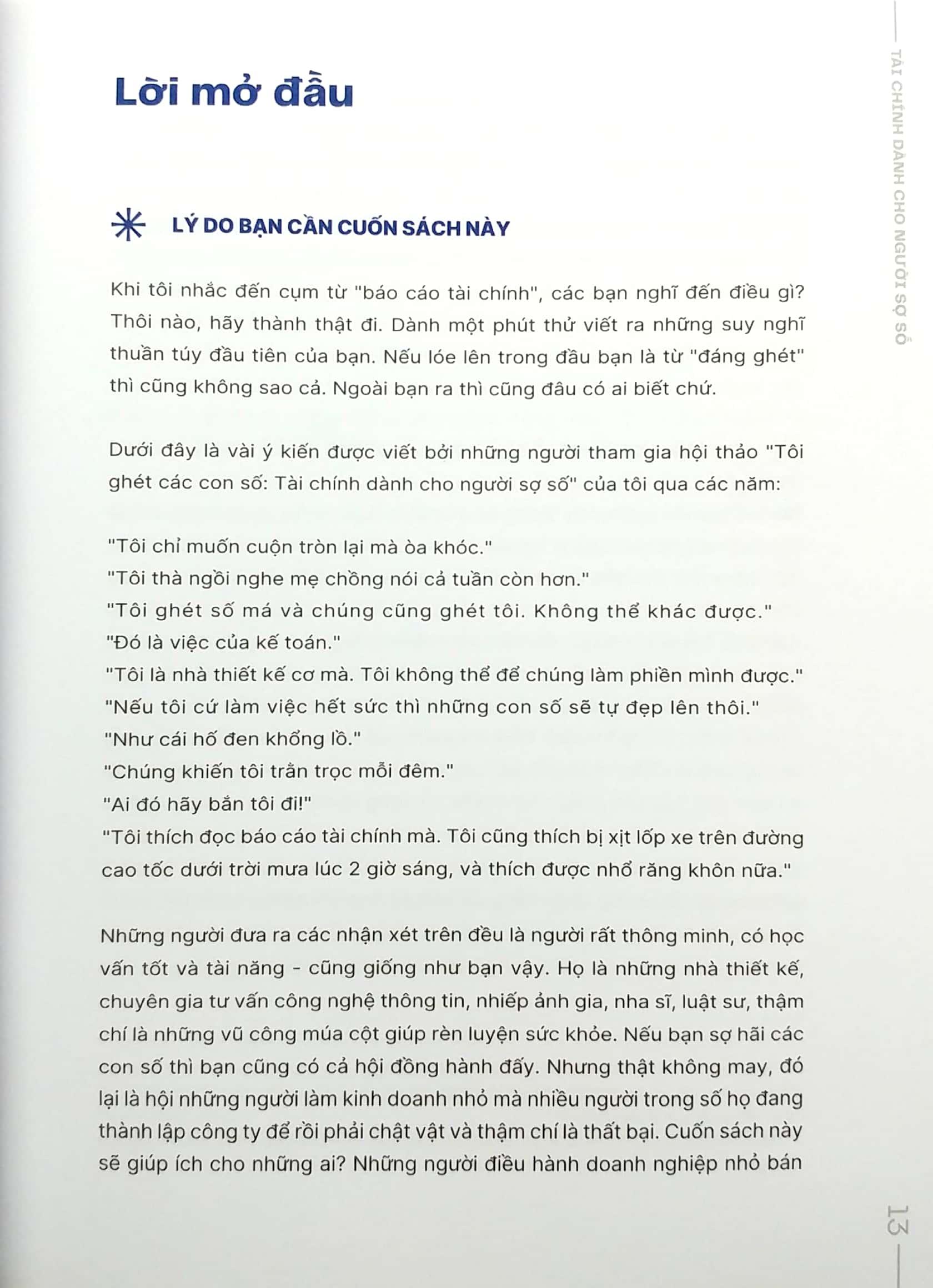 Tuy nhiên không phải ai cũng có nền tảng bài bản về tài chính, hay thậm chí gặp khó khăn lớn trong việc hiểu các con số. Vì vậy Dawn Fotopulos - Chuyên gia tài chính từ phố Wall, từng nắm giữ nhiều vị trí quan trọng trong các doanh nghiệp lớn và những chuyên gia tài chính tại Việt Nam sẽ mang tới cho bạn - những người sợ số các phương pháp, kiến thức về tài chính doanh nghiệp một cách đơn giản, dễ hiểu nhất chỉ trong một cuốn sách.