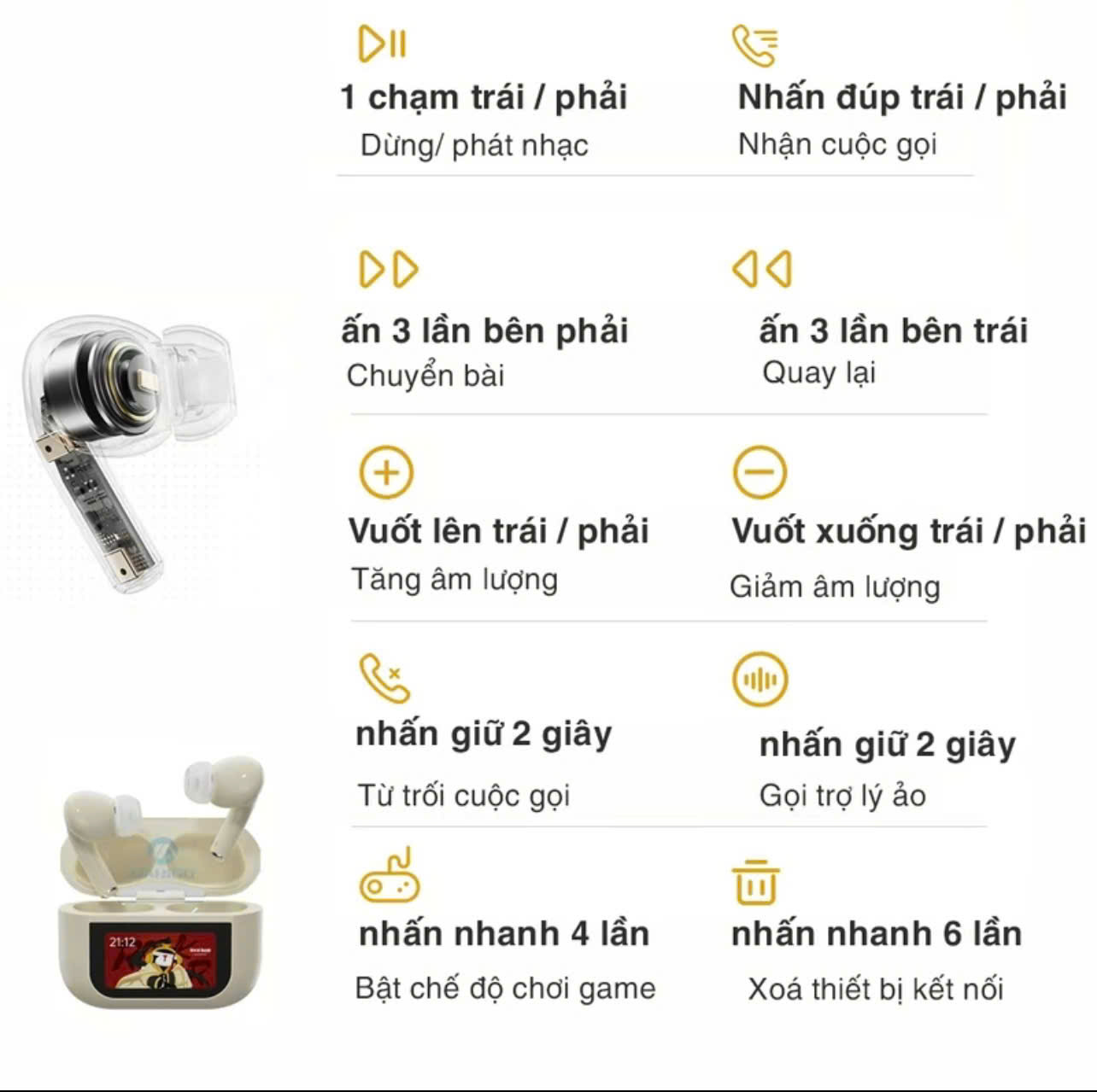 - Tai nghe bluetooth không dây nhét tai chống ồn chủ động ANC Rockspace A5 pro có màn hình cảm ứng LCD trên tai nghe giúp mình cài đặt được ngày giờ, có chế độ tìm tai nghe, thay đổi màn hình chờ,..