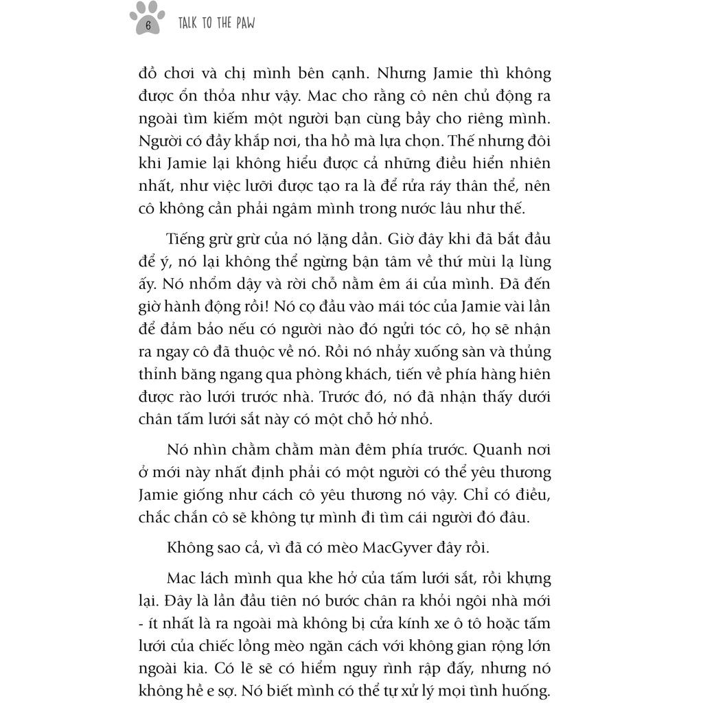 “Mac ngoạm lấy miếng vải bông. Nó nhấm nháp cả mùi lẫn vị tỏa ra từ vật đó. Rồi với cảm giác chiến thắng ngập tràn, nó nhảy trở lên bệ cửa sổ rồi biến mất vào trong bóng đêm với chiến lợi phẩm bay lất phất phía sau.”