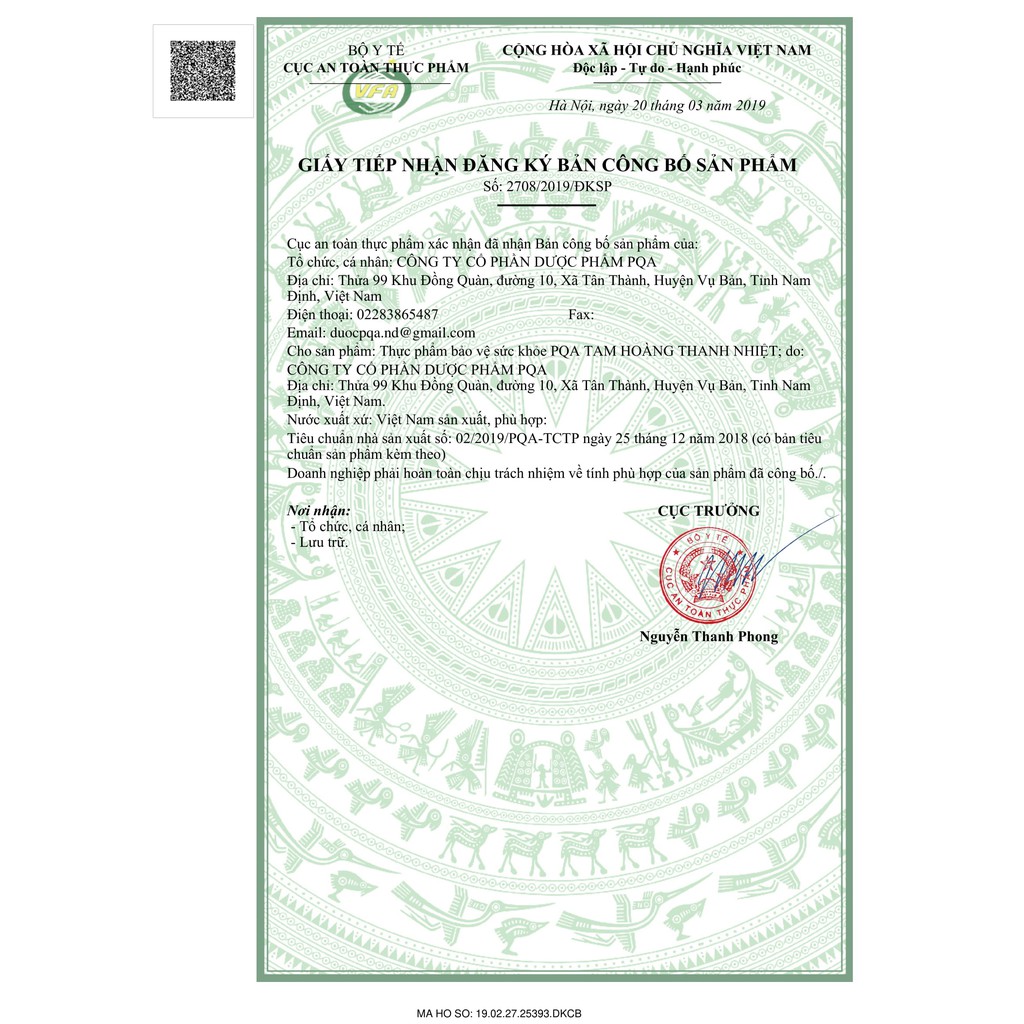 - Địa chỉ sản xuất: Công ty Cổ phần Dược phẩm PQA. Thửa 99, Khu Đồng Quàn, Xã Tân Thành, Huyện Vụ Bản, Tỉnh Nam Định. THÀNH PHẦN: