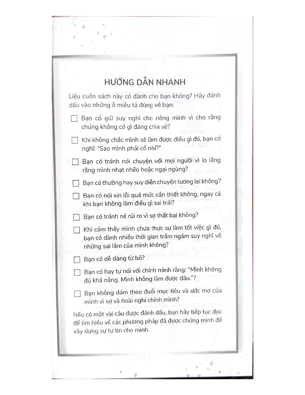 - Giới thiệu Sống Tự Tin Cuốn cẩm nang tự tin này sẽ mang đến cho bạn những phương pháp thực tế, dễ tiếp cận, giúp bạn trở thành phiên bản tốt nhất của chính mình, đồng thời xóa tan sự nghi ngờ bản thân với: Chương trình 5 bước bắt đầu với việc vạch ra mục tiêu và sử dụng các phương pháp hiệu quả để nuôi dưỡng sự chấp thuận, chánh niệm, tự trắc ẩn,… Các bài tập tương tác bao gồm suy ngẫm, danh sách cần thực hiện và câu hỏi gợi mở giúp bạn tiếp thu bài học và khái niệm. Hướng dẫn bạn hiểu rõ định nghĩa về sự tự tin và cách xác định mức độ tự tin ban đầu của bạn. Sách là lựa chọn hàng đầu cho những ai muốn cải thiện sự tự tin trong mọi khía cạnh cuộc sống. Bạn sẽ học được cách vượt qua những cạm bẫy liên quan đến sự tự tin trong các mối quan hệ, công việc và sức khỏe.